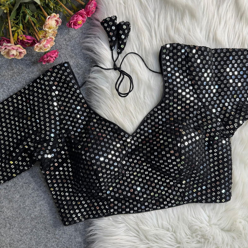 Dazzle this Navratri in our red Sabyasachi style blouse, crafted from premium fox georgette with intricate sequence work. This festive-ready blouse is perfect for Garba and Dandiya nights, featuring a designer neck pattern, padded comfort, and traditional charm. The rich red hue makes it a standout readymade blouse for Navratri.
