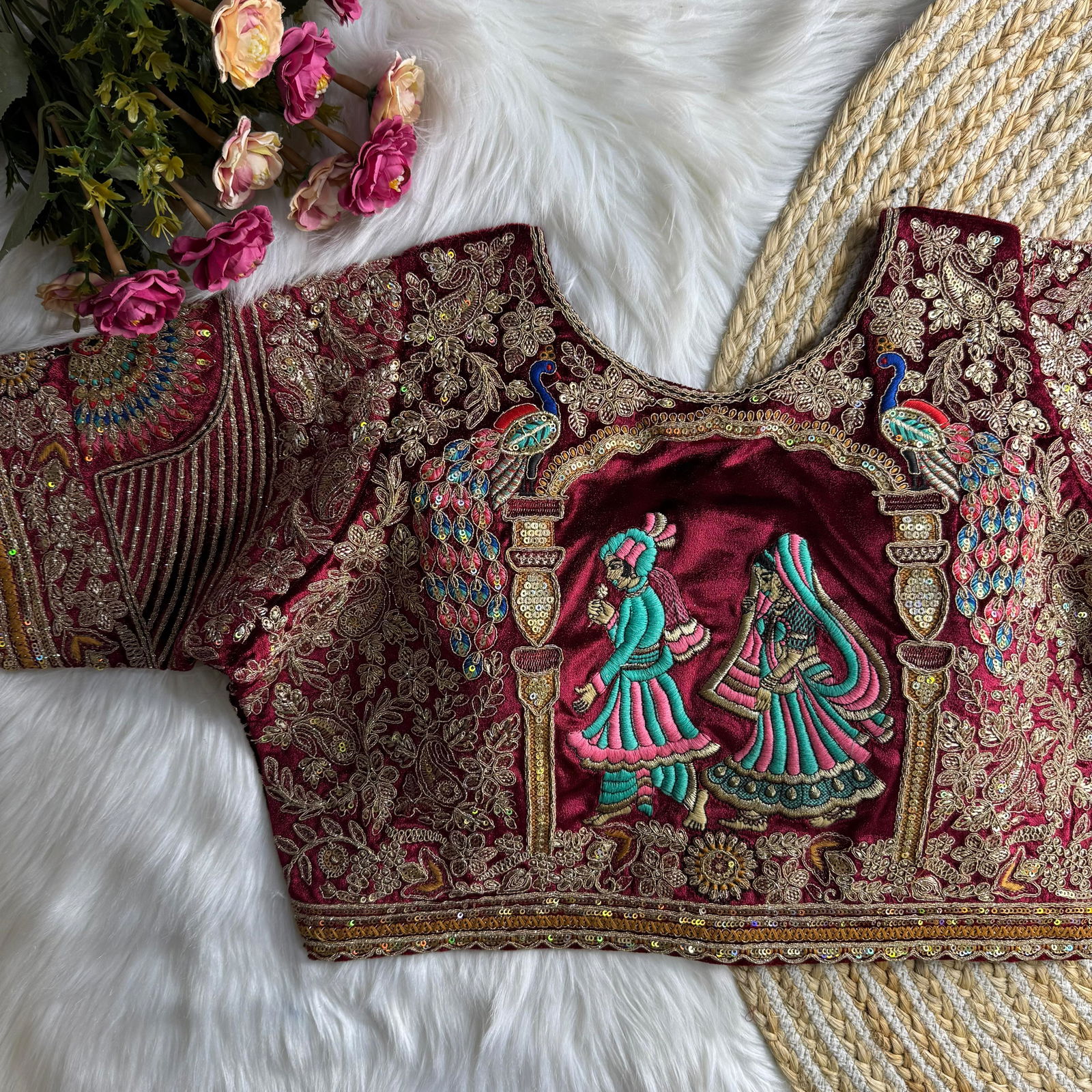 Make a grand bridal statement with our Heavy Velvet Real American Diamond Long Stitch Bridal Blouse. Crafted from pure soft velvet and detailed with real American diamond work, this readymade blouse exudes luxury. Perfect for bridal looks, this designer blouse features heavy padding, handmade hooks, and stunning latkans for an elegant finish.