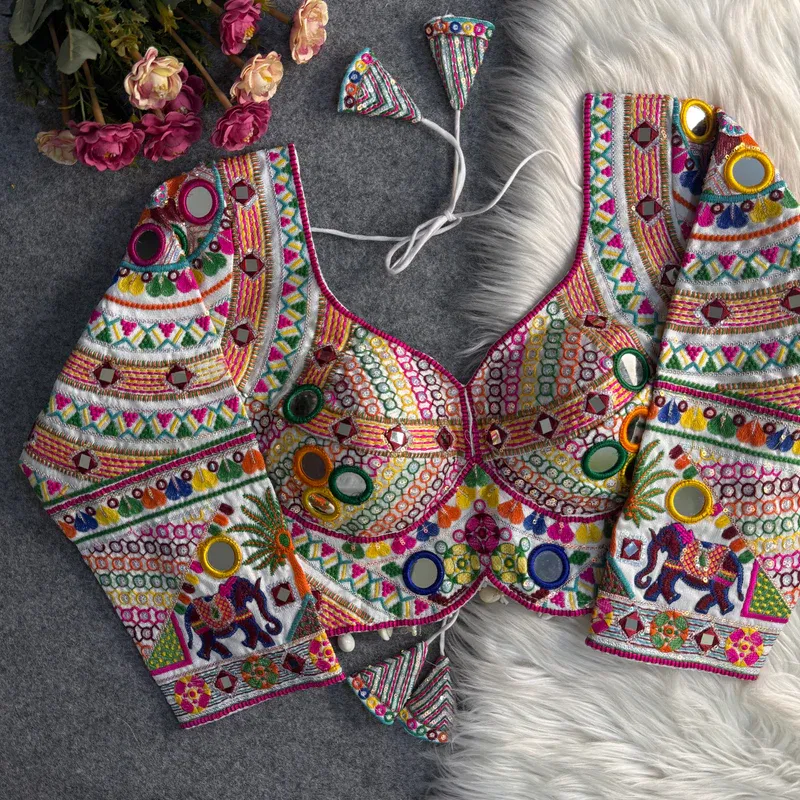 Make a dazzling statement this Navratri with our White multicolor full sleeves mirror work blouse. Designed for Garba nights, this blouse features heavy embroidery, hand mirror detailing, and rich sequence on premium Italian silk. Perfect for traditional flair, it adds elegance and sparkle to your Navratri outfit with its stylish back-open fit.