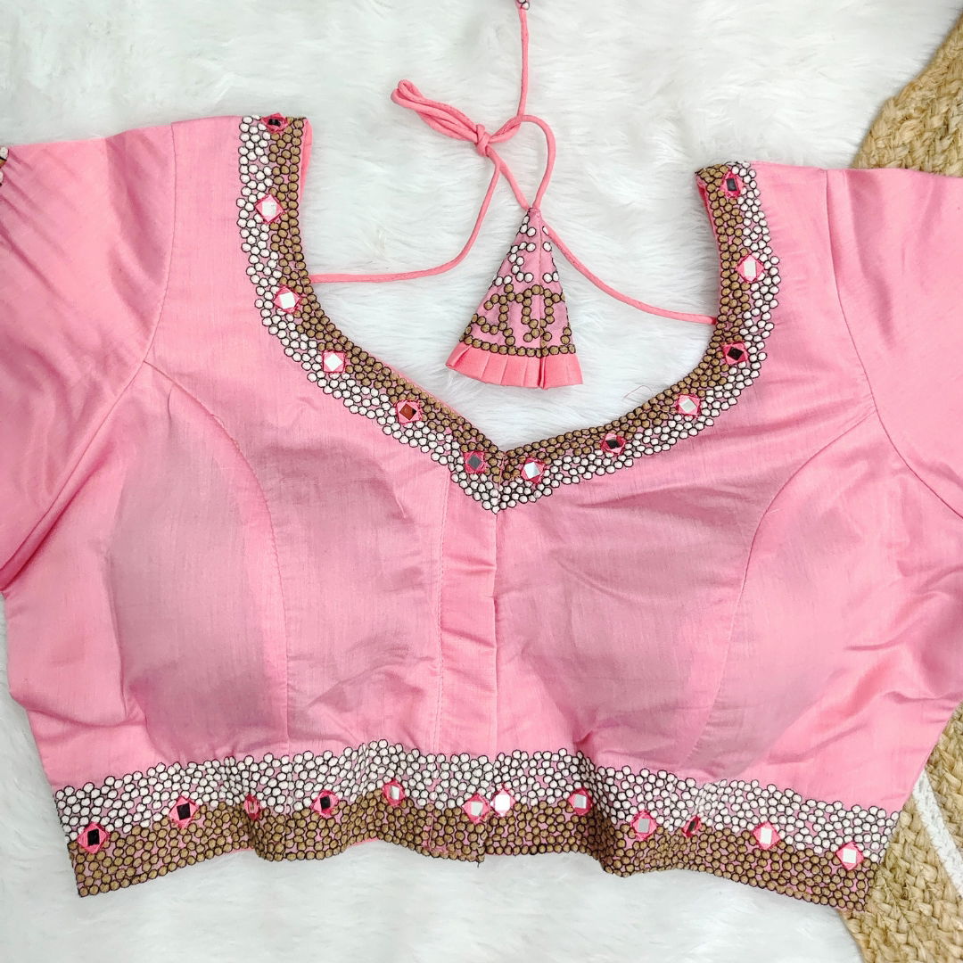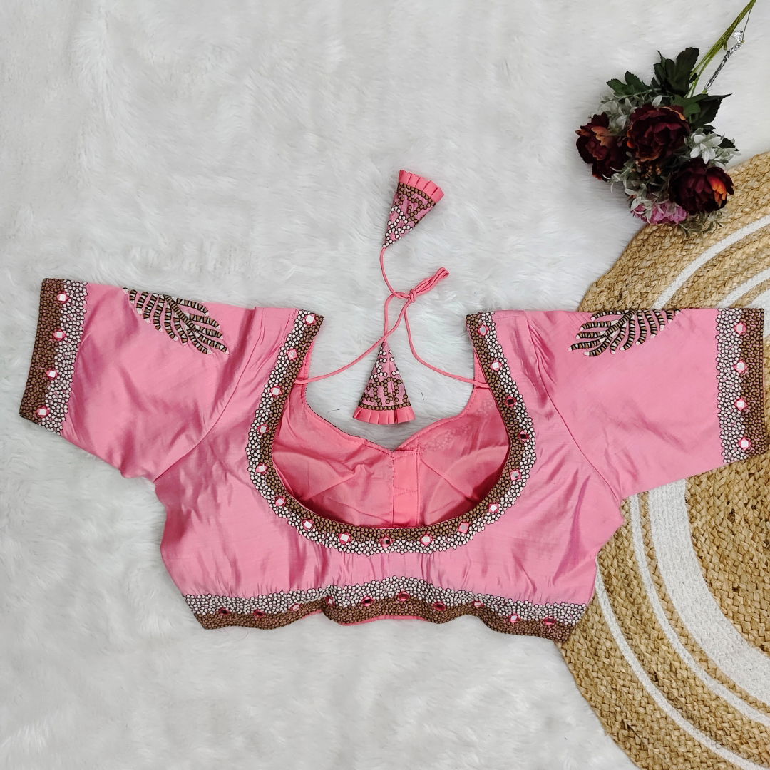 Pure Timo Silk handmade designer blouse with heavy thread embroidery and intricate handwork. Features real mirror embellishments. Elegant, unique, and perfect for special occasions.