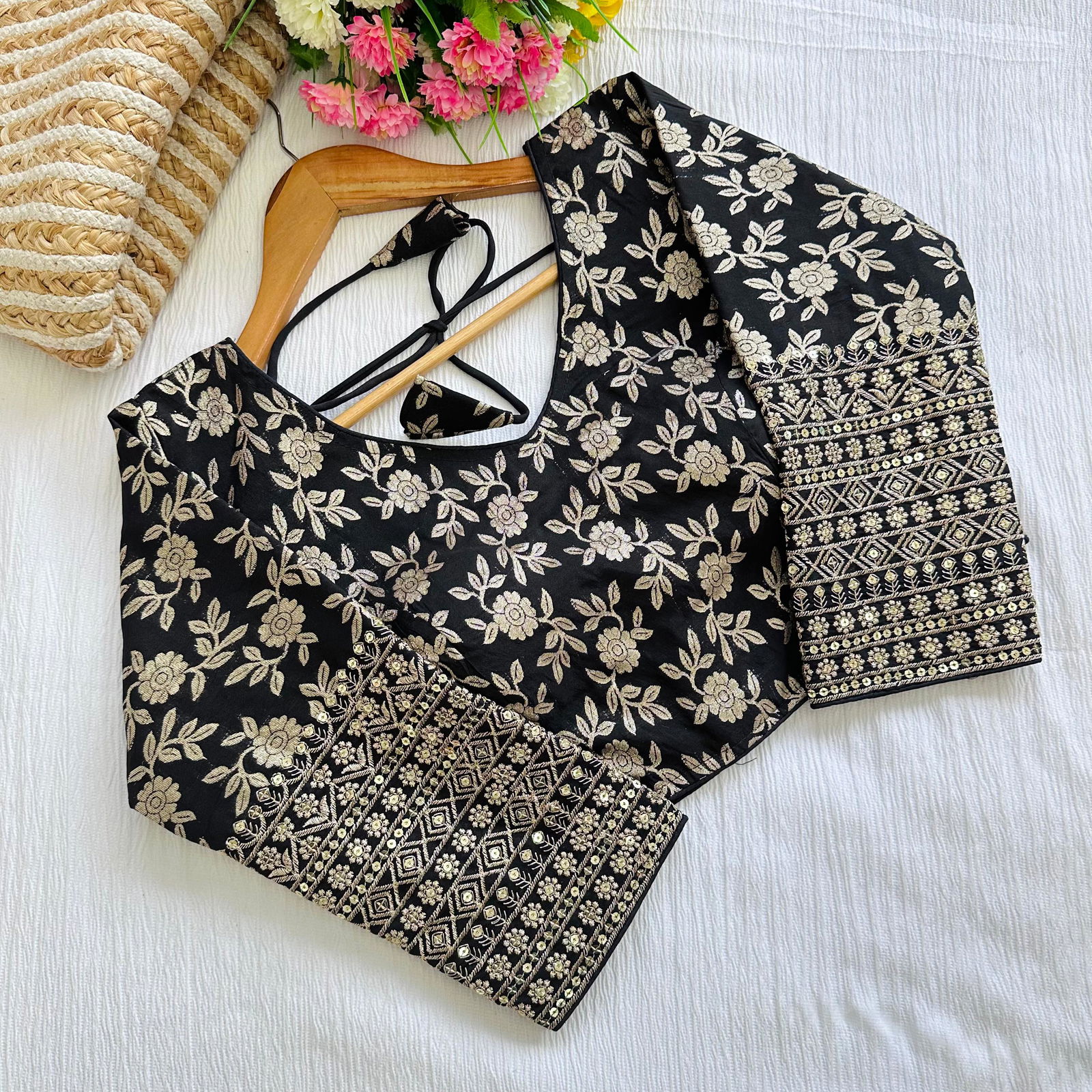 Beautiful golden jari all over blouse with heavy embroidery work in sleeves of blouse