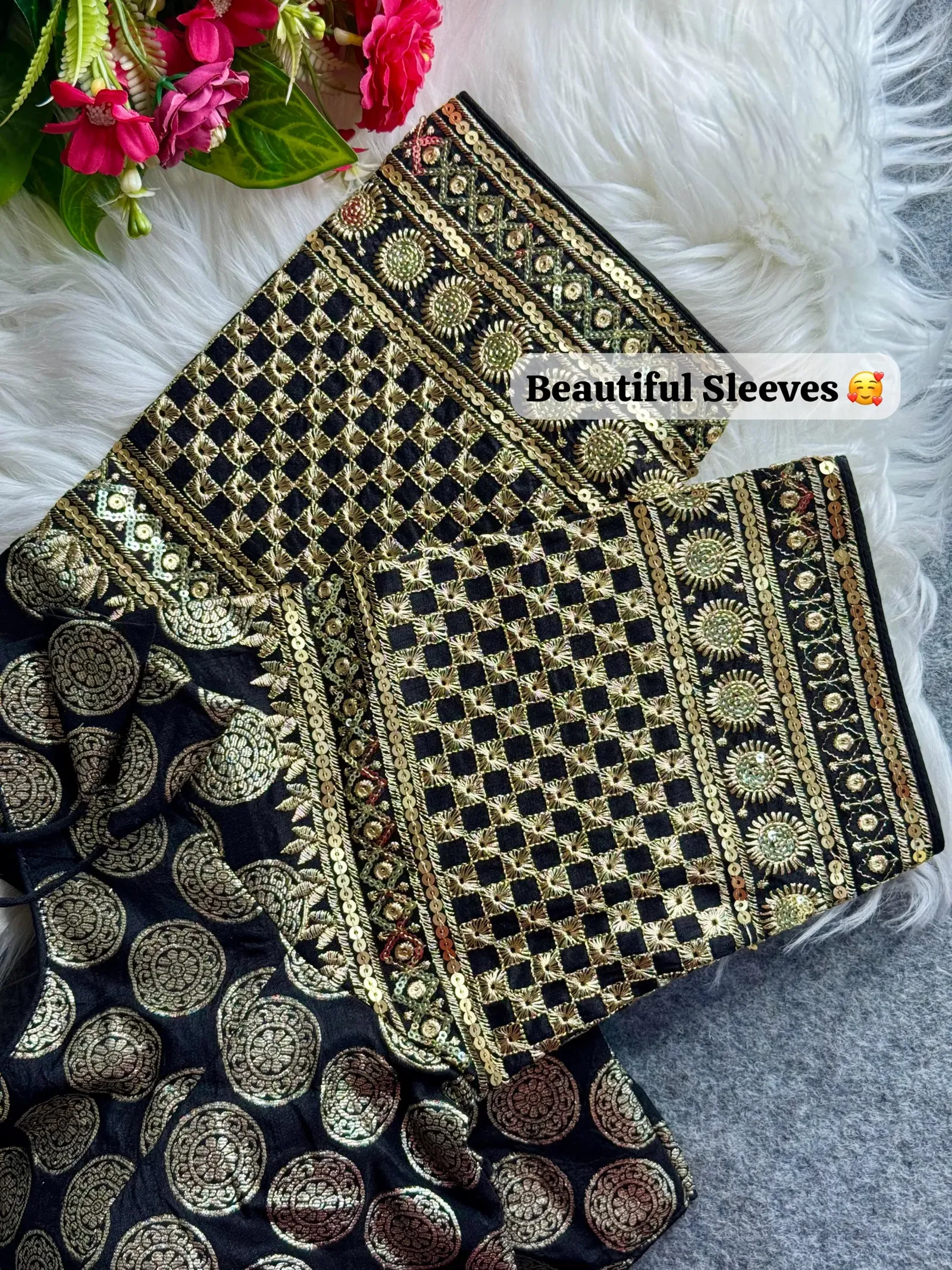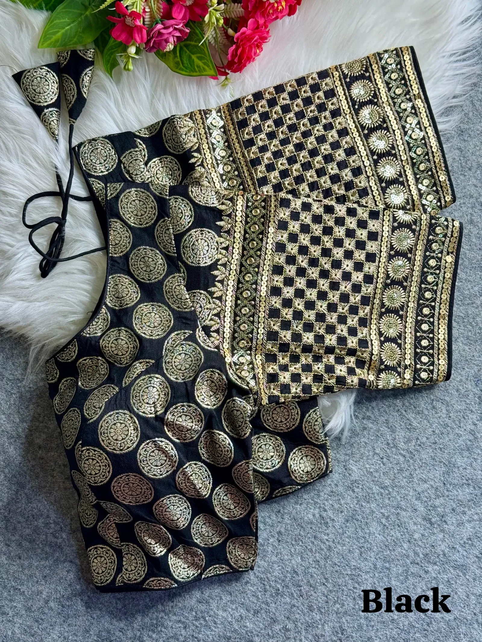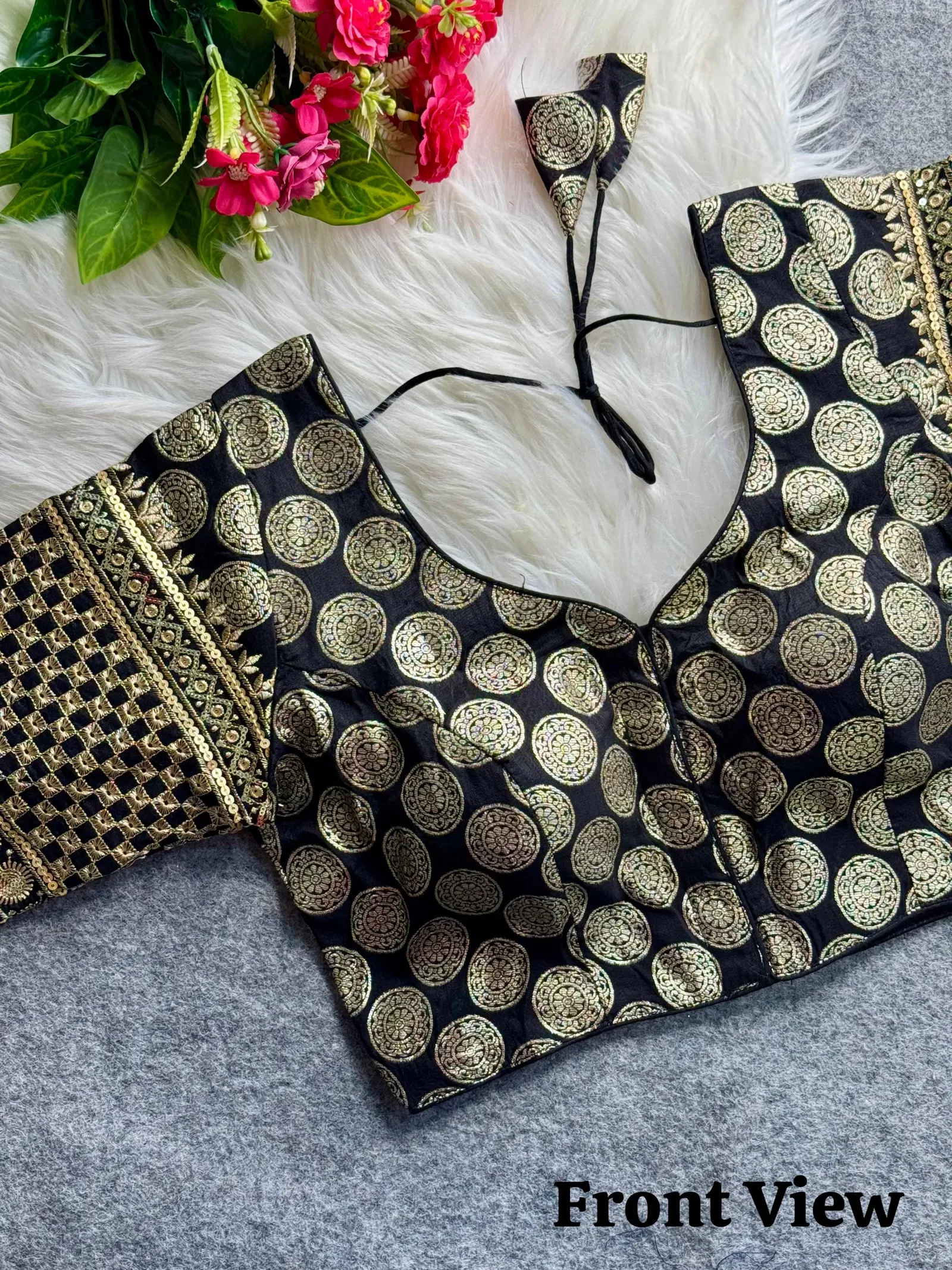 Step into elegance with this exquisite partywear blouse crafted from premium Dola silk, featuring intricate heavy embroidery. Designed for comfort with pure Indo cotton lining, it offers a flattering front-open style, 12-inch sleeves, and heavy padding for a structured fit. Ready in size 38, alterable up to 40 inches, this blouse is perfect for special occasions.