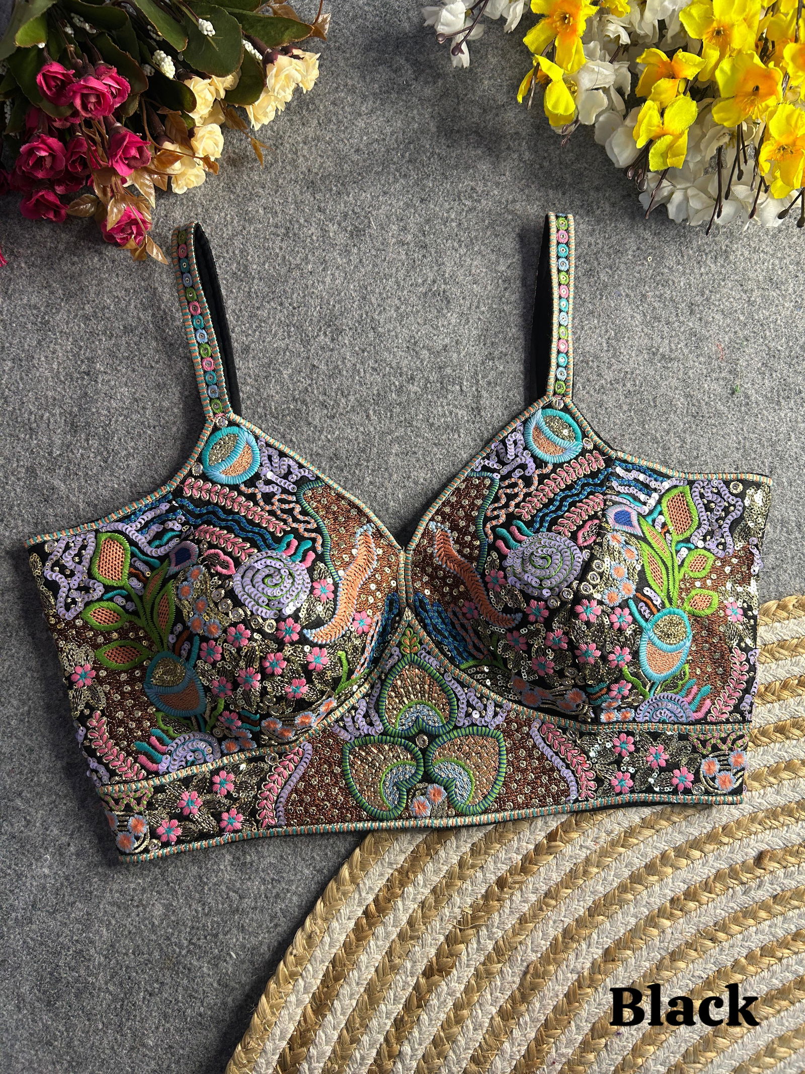 Elevate your ethnic wardrobe with this stunning sleeveless spaghetti blouse, crafted from luxurious heavy Italian silk. Adorned with intricate embroidery and sequence work, it exudes elegance and charm. Featuring heavy padding, fine stitching, and a stylish back-open design, this blouse is available in size 40, alterable up to 42-44 inches.
