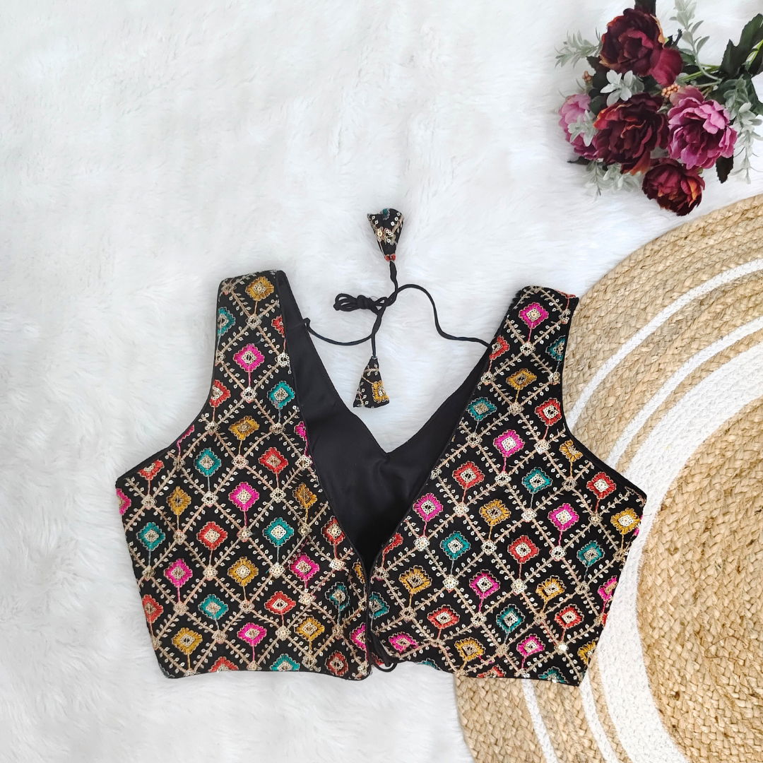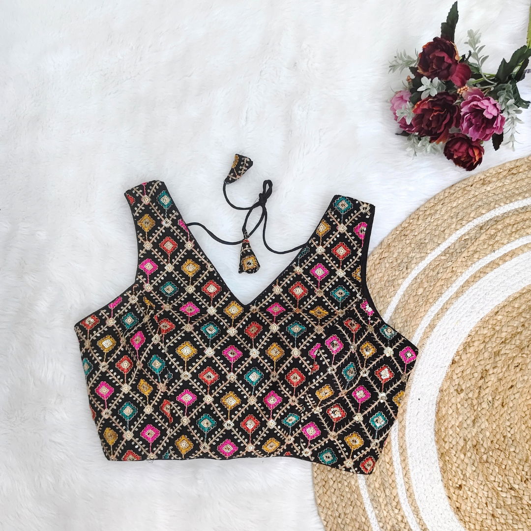 Georgette fabric blouse with multi-color embroidery, perfect for Navratri. Lightweight, vibrant, and stylish, ideal for festive celebrations. Enhance your look with this unique design.