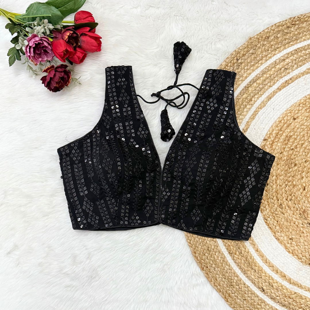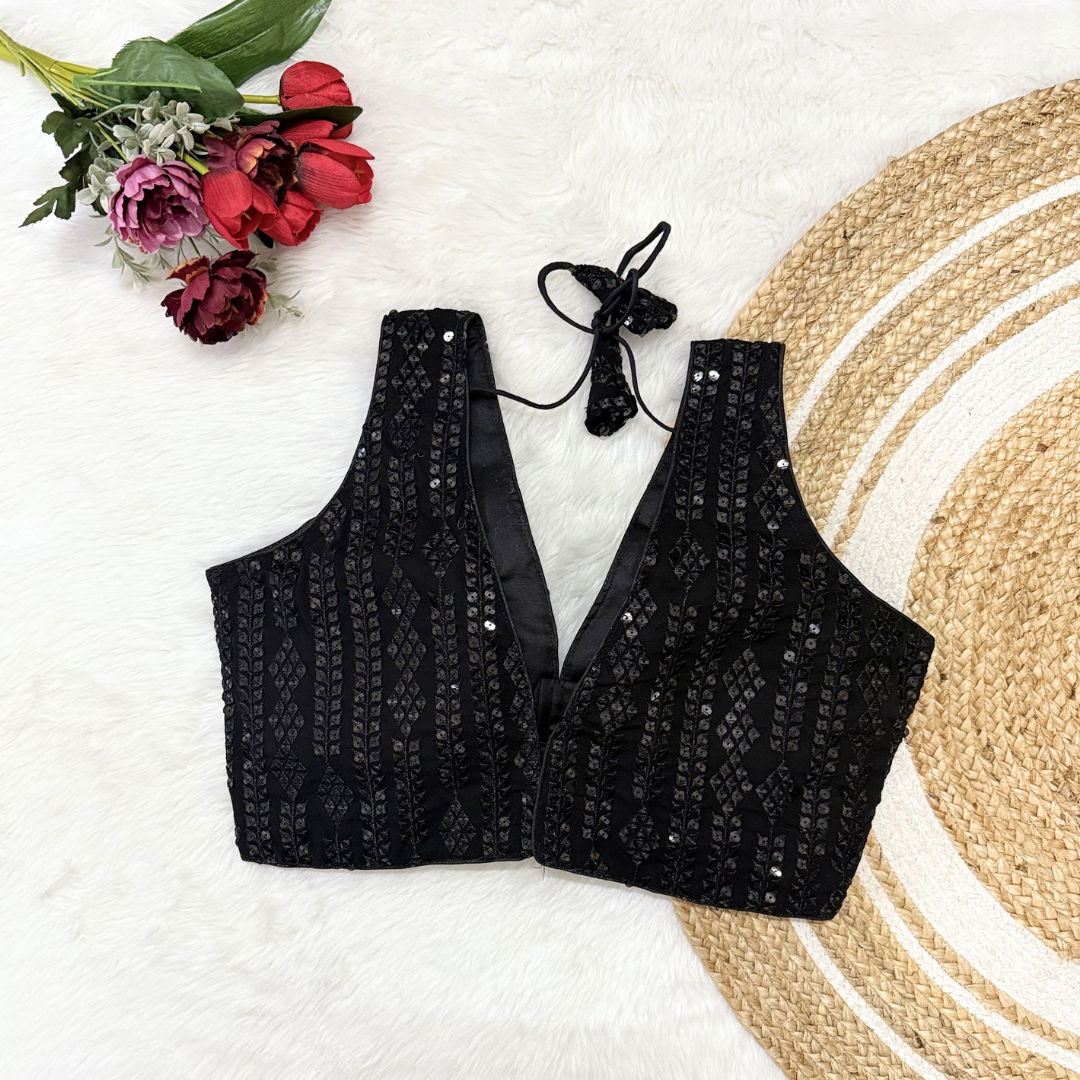 Grace any occasion with this elegant georgette blouse, adorned with stunning star sequence and zari work. Featuring a chic V-neck design and 9-inch sleeves, this blouse is perfect for modern ethnic styling. Available in 3 sophisticated colors, it combines elegance and comfort for a flawless partywear look.