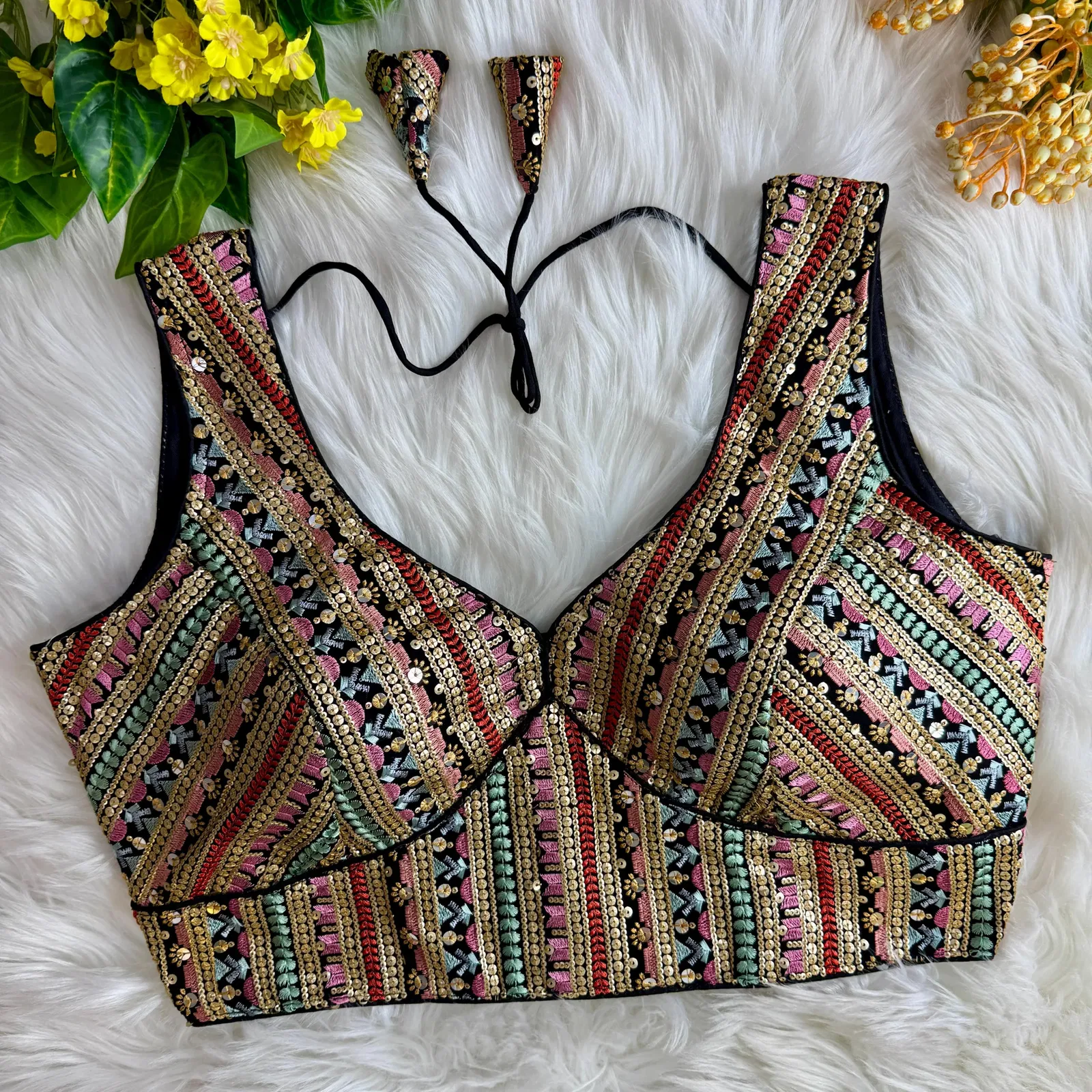Elevate your style with this stunning partywear blouse crafted from heavy blooming soft Fox Georgette. Featuring intricate viscose thread embroidery, it offers 12-inch attached sleeves, heavy padding, and detailed stitching. The back-open design with handmade hooks and elegant latkans adds a luxurious touch. Ready at size 38 and alterable to 40 inches.