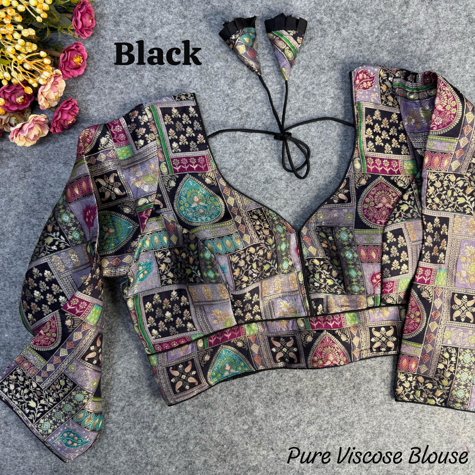 Embrace vintage elegance with this stunning long-sleeve blouse crafted from heavy pure viscose jacquard. Featuring exquisite position print work, heavy stitching, and padding for a structured fit, this blouse is designed to make a statement. The back-open style with delicate latkans adds charm. Available in 6 beautiful colors, ready in size 40, alterable up to 42 inches.