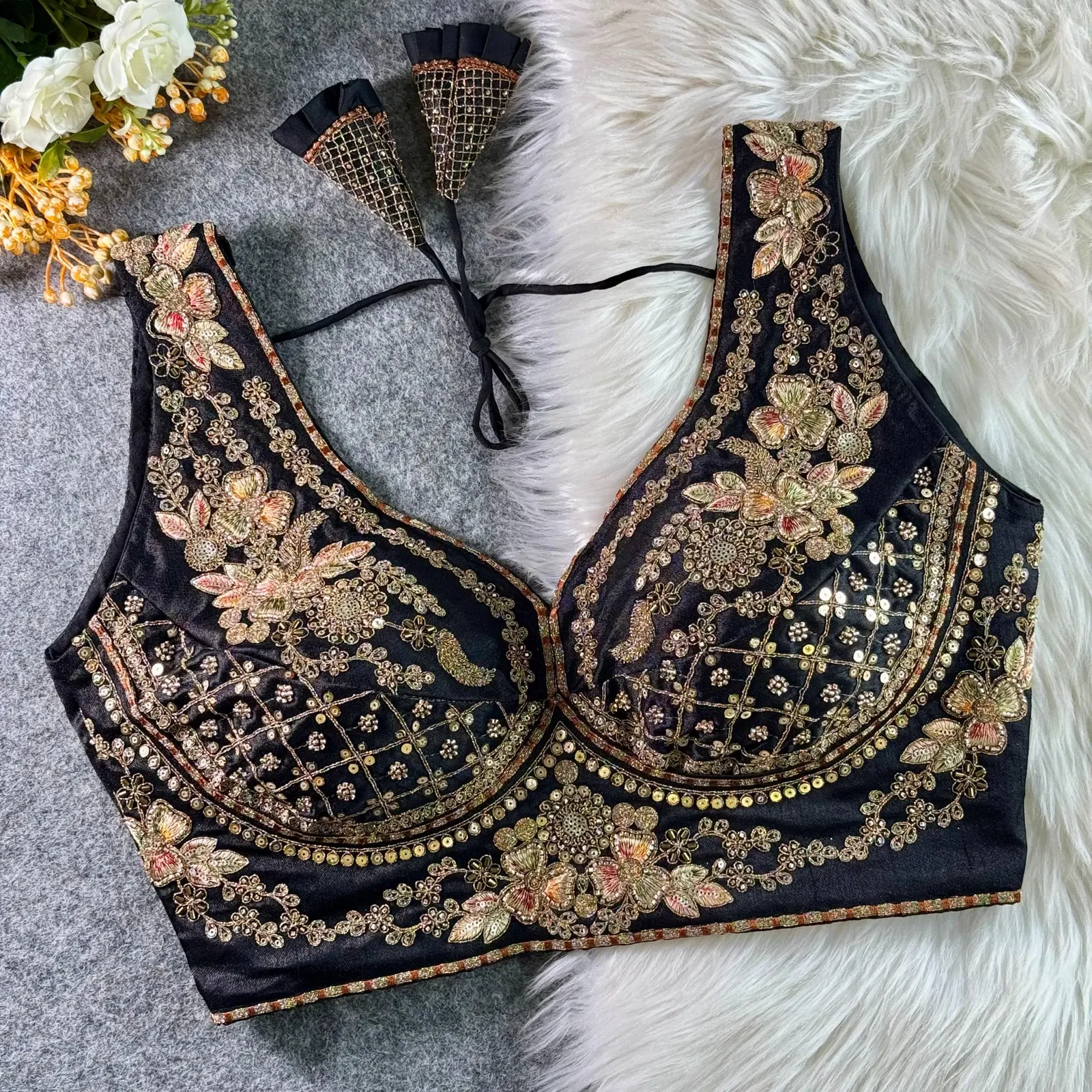 This designer blouse is a perfect pick for weddings and festive occasions. Made from Heavy Pure Soft Italian Silk, it features exquisite handwork with sequence and codding thread embroidery. With a flattering back-open style, this partywear blouse is padded, beautifully stitched, and finished with elegant latkans and handmade hooks.