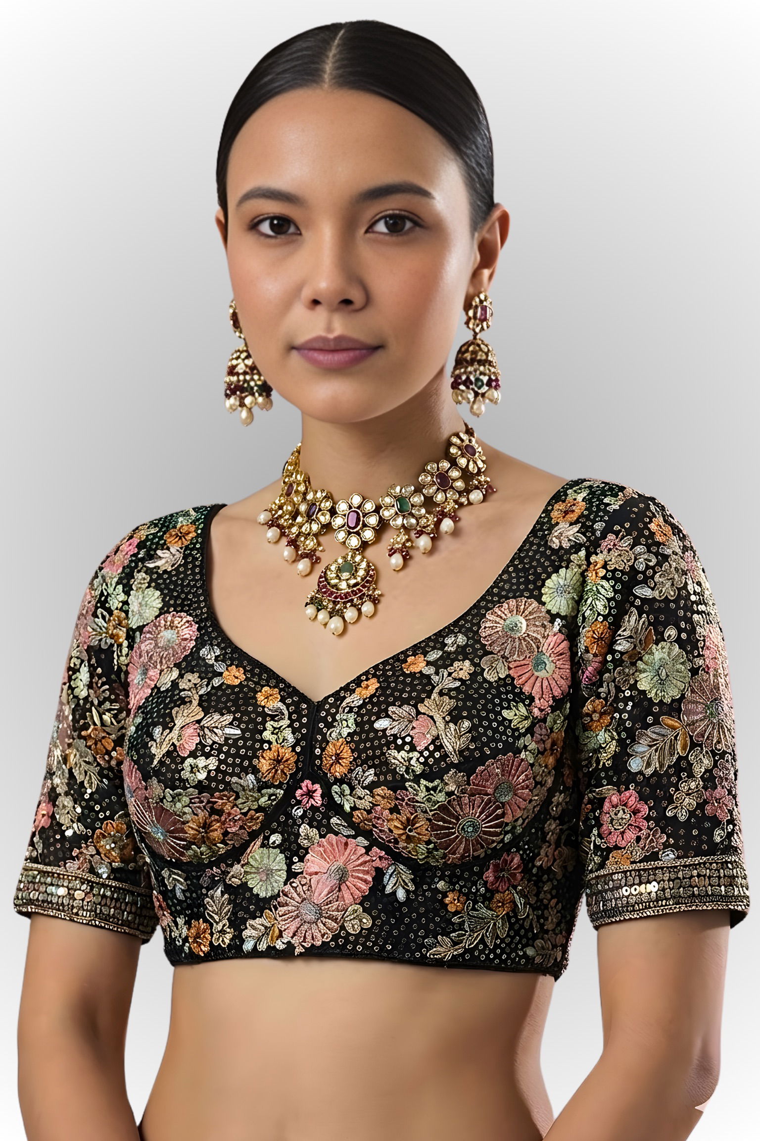Step into elegance with this stunning wedding and partywear blouse made from heavy Fox Georgette. Featuring rich sequence and embroidery work, it comes with 9-inch long sleeves, heavy padding, and designer back-open styling. A perfect choice for festive and bridal occasions, offering comfort and flair in size 40, alterable up to 42.