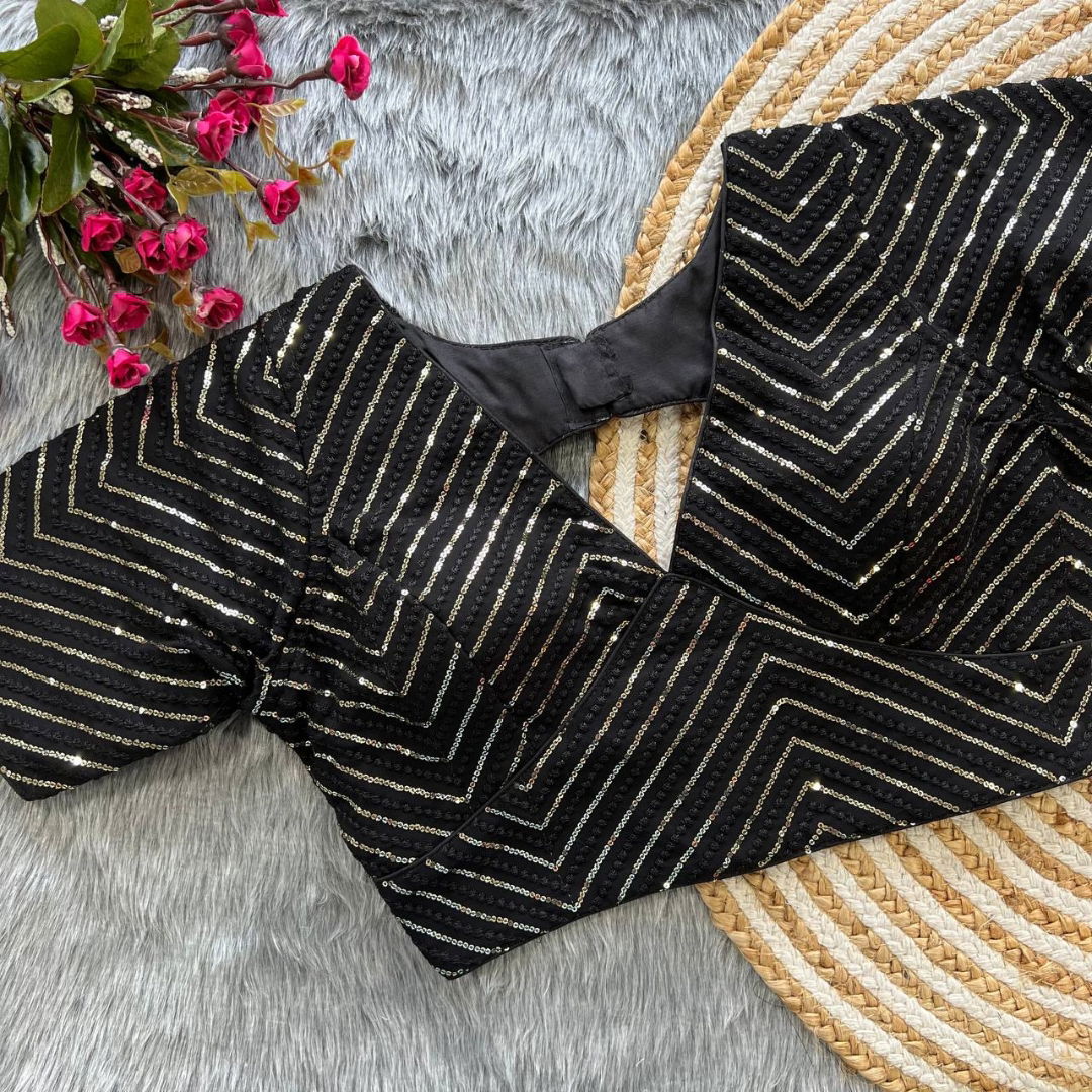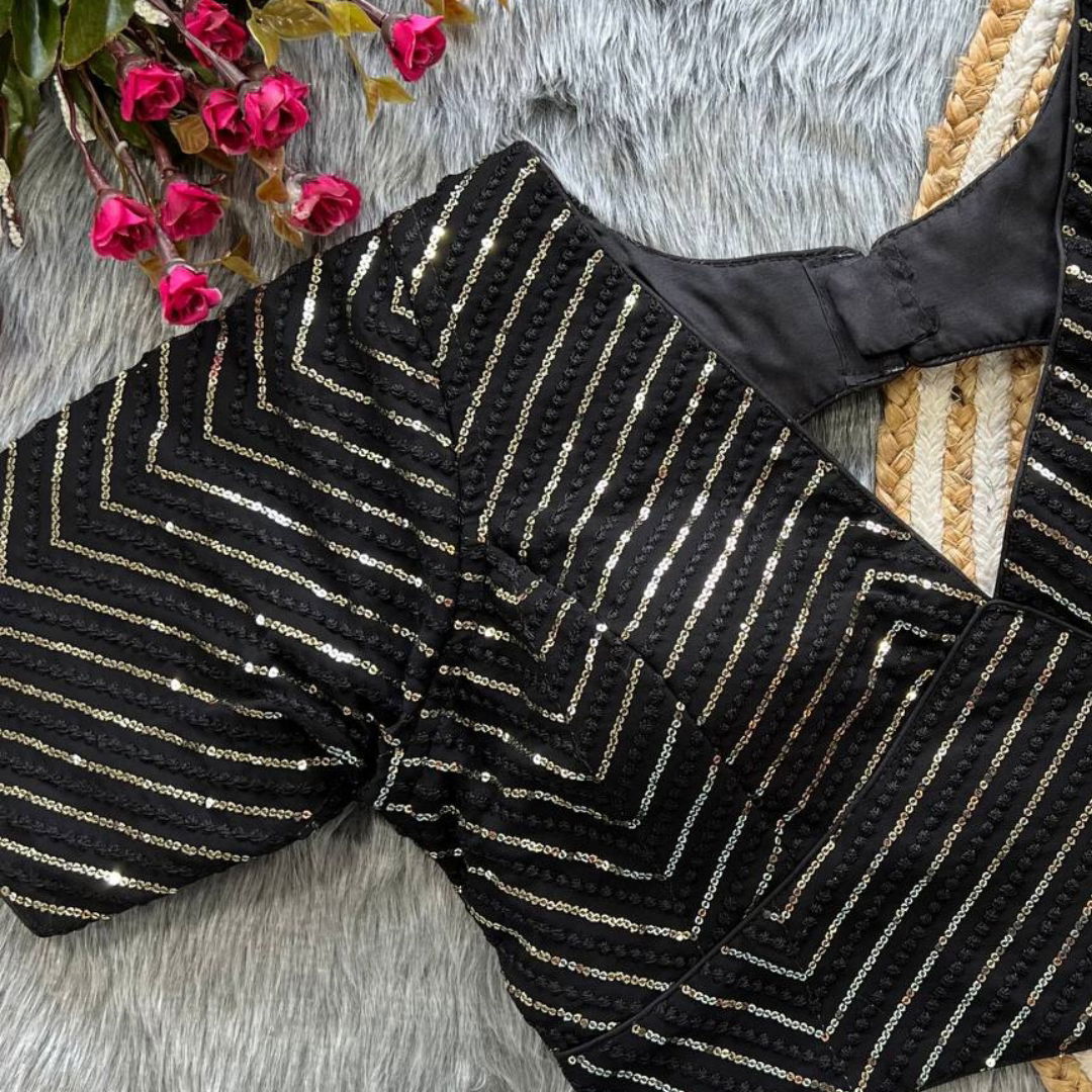 Step into style with this fancy partywear blouse made from premium heavy fox georgette. Featuring intricate sequence embroidery, soft padding, and elegant 12-inch sleeves, this blouse offers a perfect blend of comfort and glam. Designed with a back open style and handmade hooks, it's ideal for festive or wedding occasions.