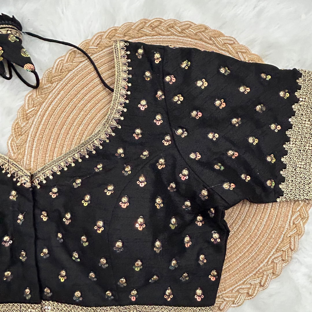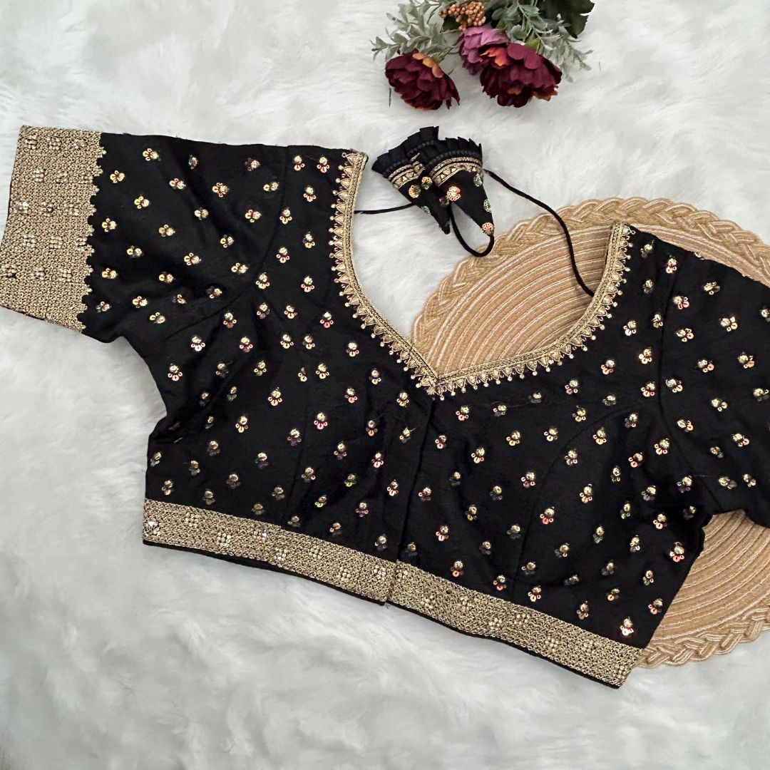 Exquisite Milan silk blouse, adorned with intricate thread sequence work, padded handmade hooks, and elegant front open design with charming latkan