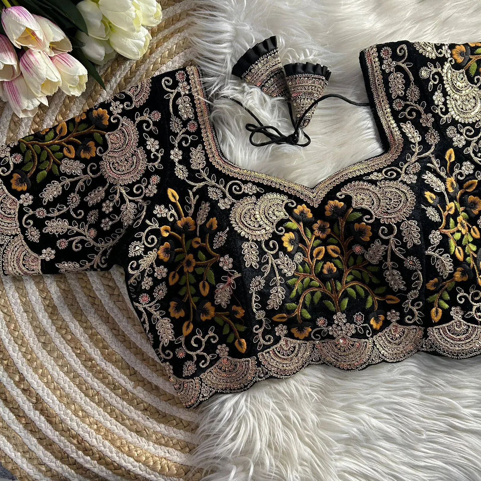 This elegant bridal blouse is made from heavy pure soft velvet with tricot fusing, perfect for weddings and special occasions. Featuring intricate embroidery work, handmade hooks, latkans, and padding, this designer blouse comes with 10-inch sleeves. Its back-open style and ready size of 40” offer comfort and regal charm.