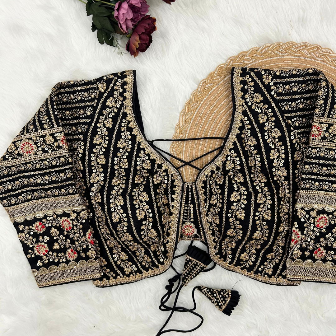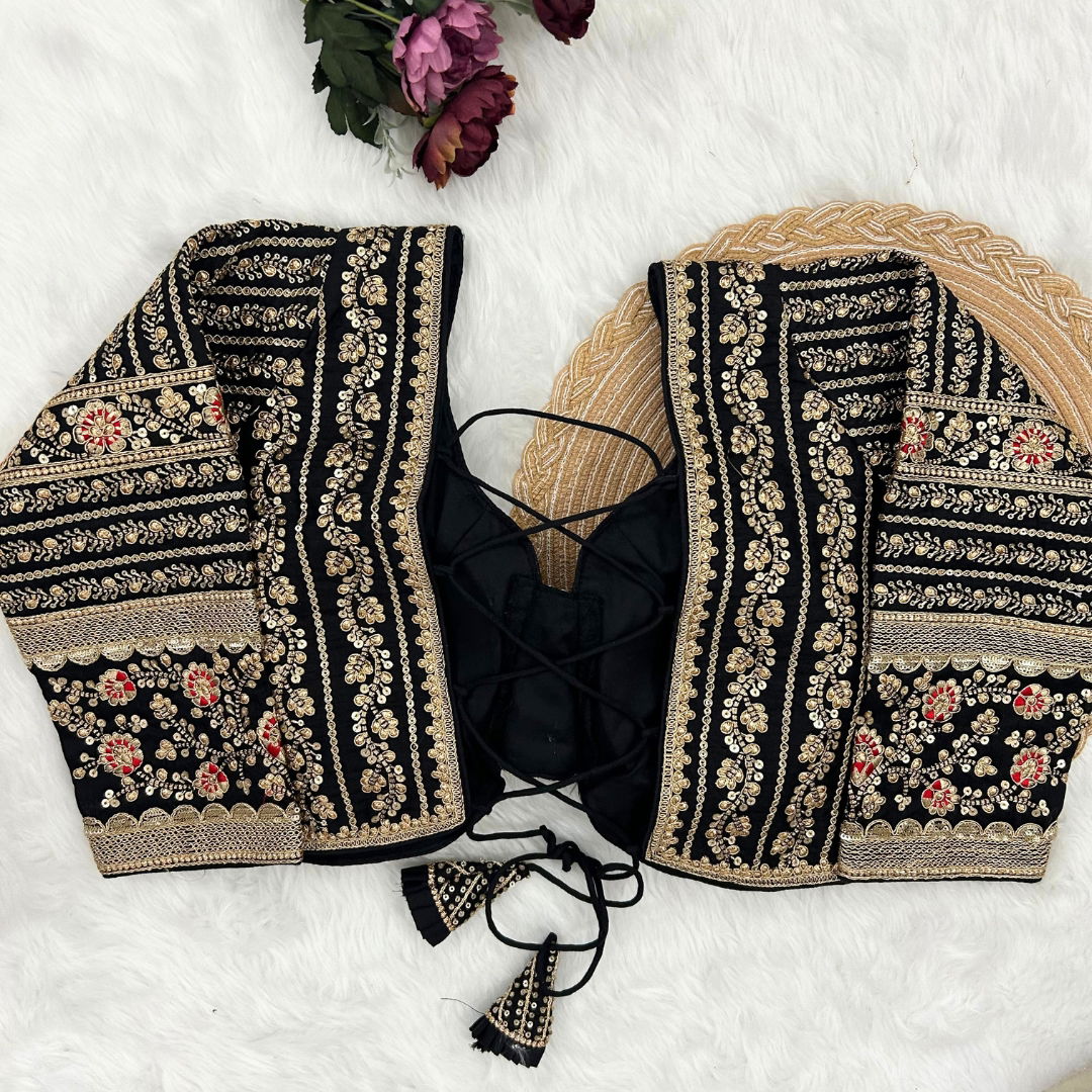 Make a statement in this beautiful bridal look blouse featuring a backless design with stylish dori. Crafted from rich Timo Silk, it comes with extra-long18-inch sleeves and soft padding for comfort. Perfect for weddings or special occasions, this designer blouse is ready in size 40 and alterable up to 44.