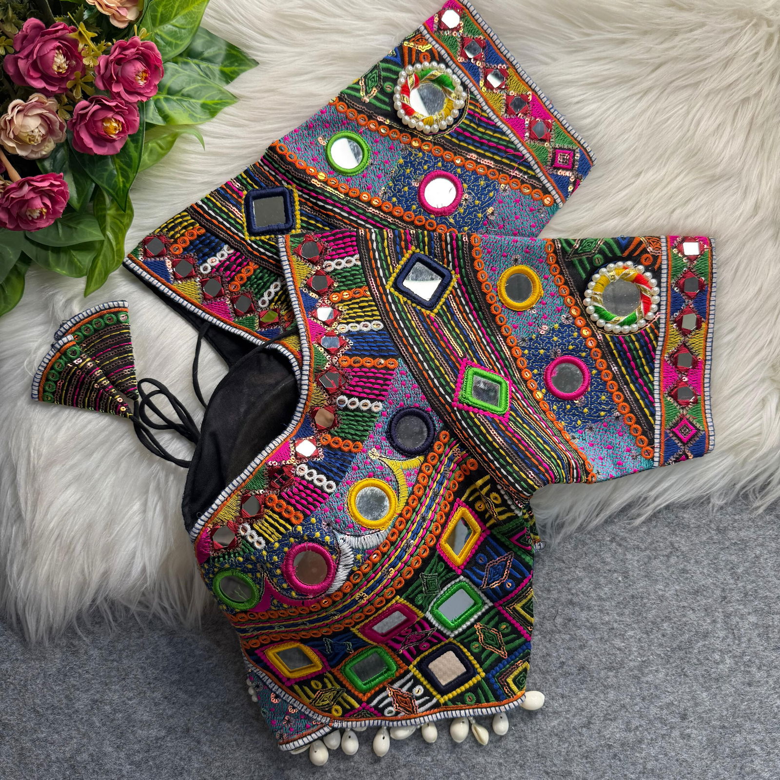 Make a grand entrance this festive season with our Navratri special mirror work blouse. Crafted from heavy Italian silk, this stylish apple cut design shines with real multi mirror work. Perfect as a readymade Navratri blouse, it’s ideal for dandiya nights and traditional looks that steal the spotlight.
