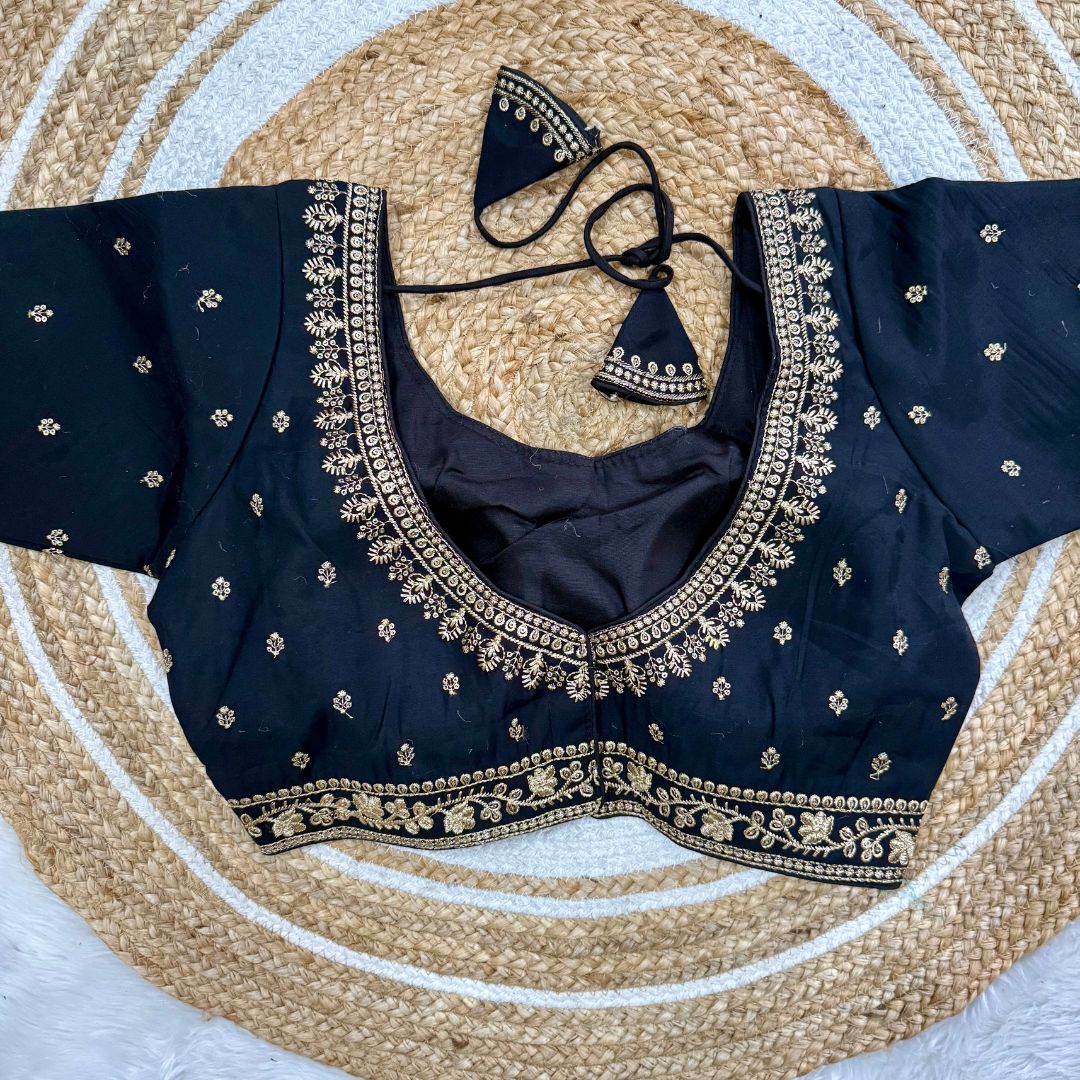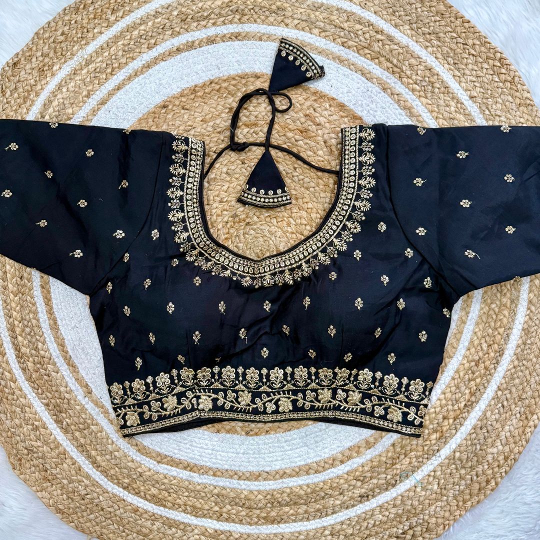 Shine effortlessly at weddings and special occasions with this exquisite bridal blouse. Made from heavy pure Roman silk, it features intricate embroidery and sequence work, 10-inch embroidered sleeves, heavy padding, and handmade hooks with charming latkans. Available in 10 stunning colors, this back-open style is ready at size 38 and alterable to 40 inches.