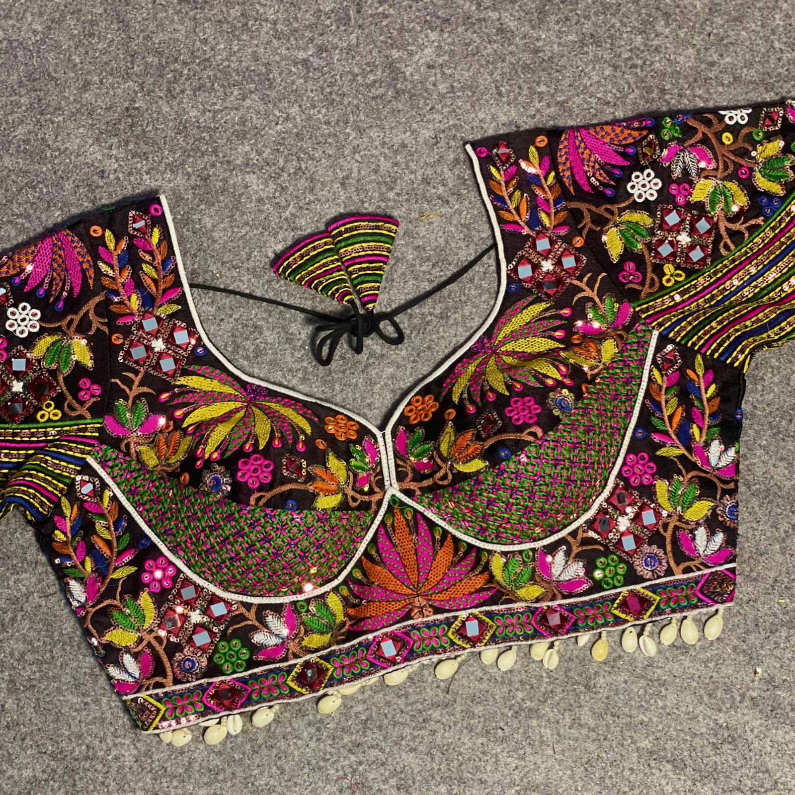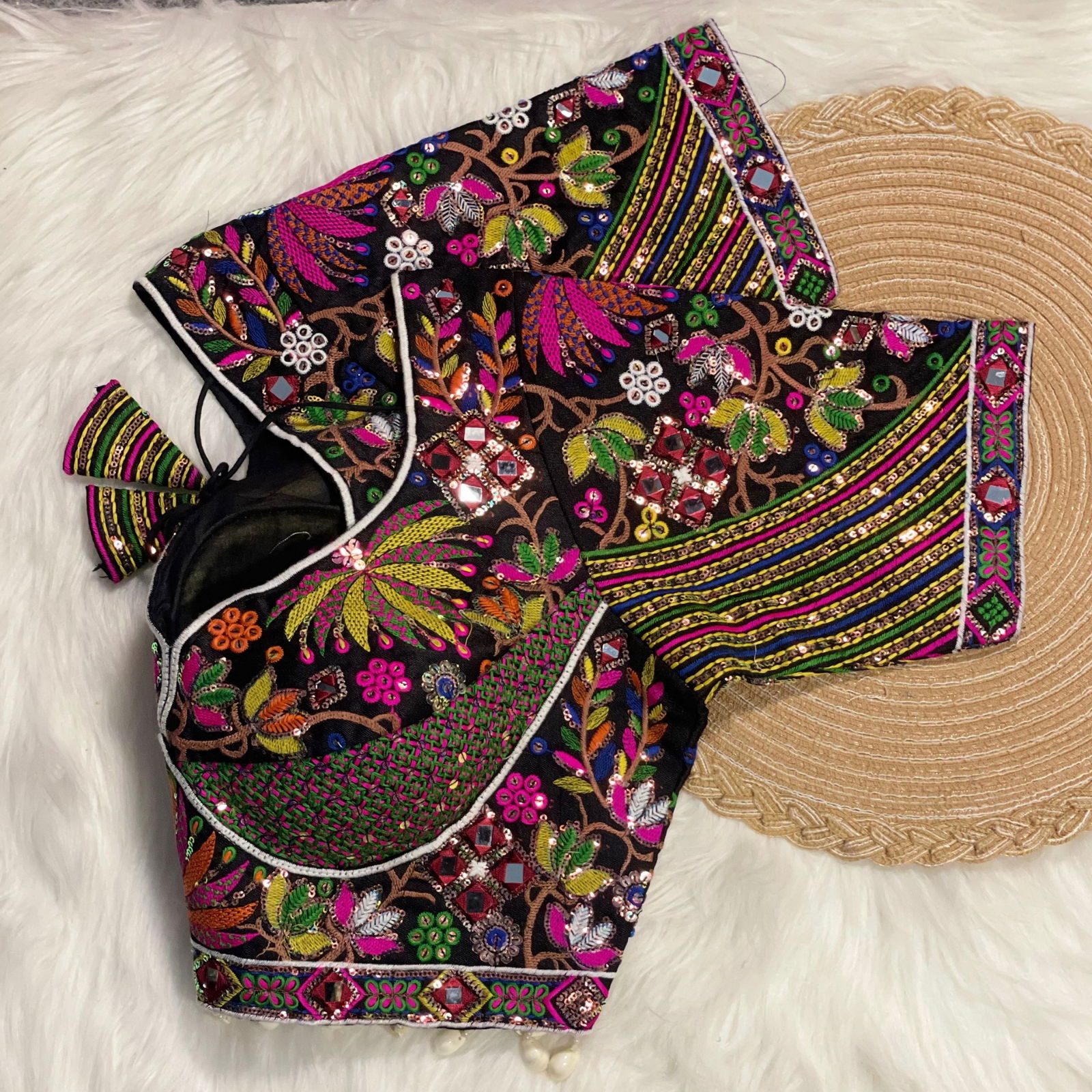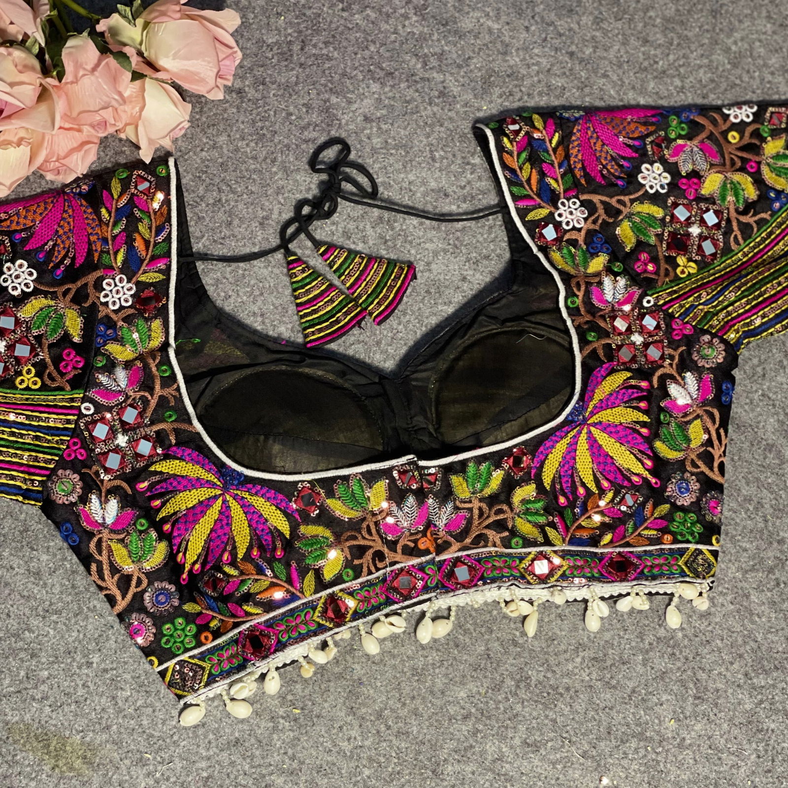 Black silk Navratri blouse with vibrant multicolor floral embroidery, work, and detailed thread patterns. Features pleated sleeves and shell lace detailing for a festive, ethnic look.