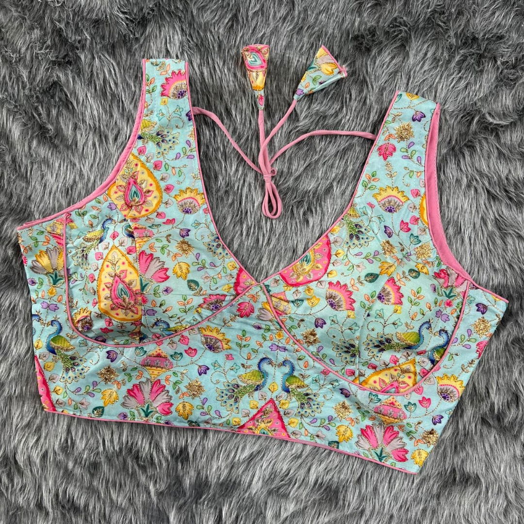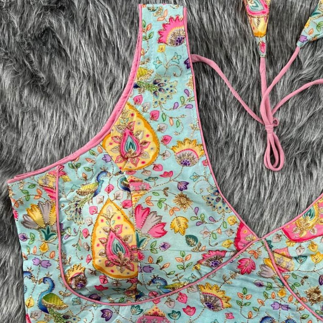 Versatile Design: The superb multicolor prints are thoughtfully curated to complement all sarees and lenghas. The back open design with hooks adds a contemporary twist.