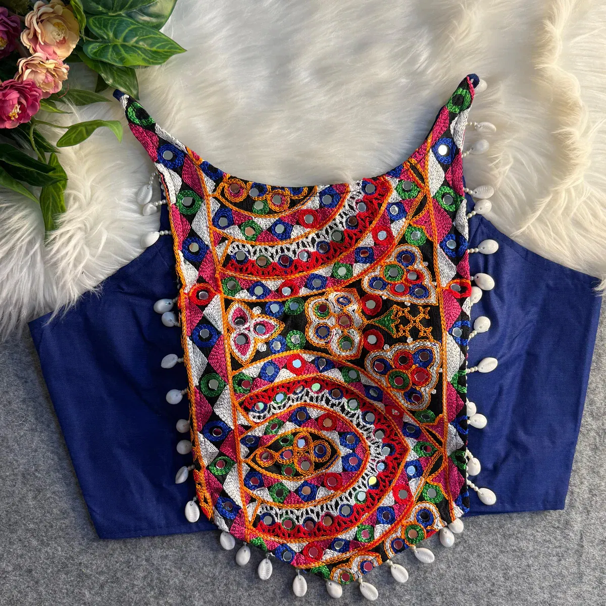 This readymade blouse in rich rayon cotton is a festive masterpiece featuring heavy coding embroidery and traditional Kaudi lace. The back-open design with handmade hooks and sleeveless finish makes it perfect for Navratri and partywear. With a beautiful fit and heavy padding, it's a must-have designer blouse for your ethnic wardrobe.