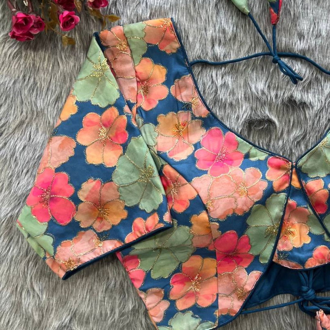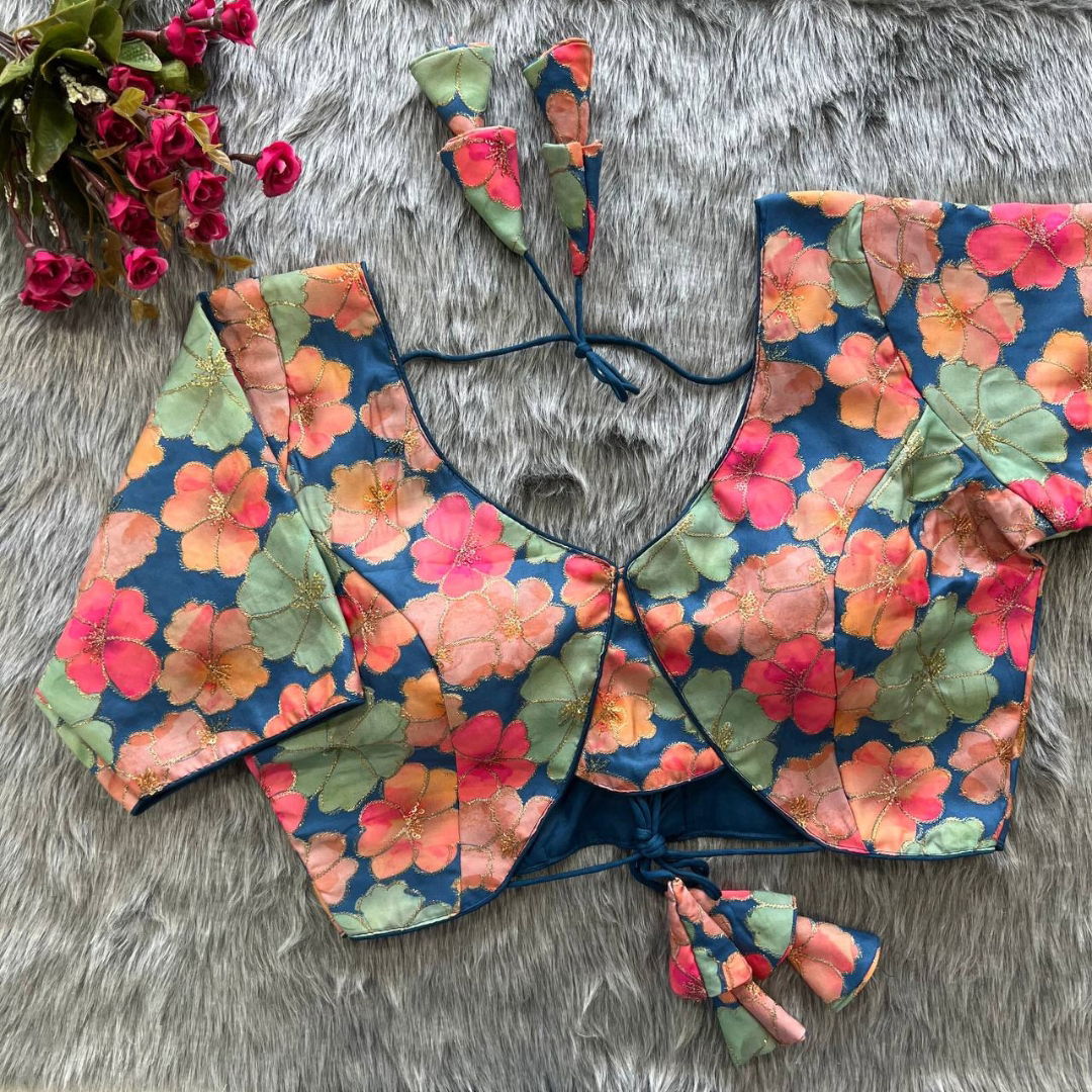 Introducing our exquisite "Fancy Partywear Blouse" crafted for those who appreciate timeless elegance. This blouse features intricate heavy embroidery with a stunning fancy pattern, elevating your style quotient effortlessly. Made from luxurious Heavy Malai Silk, the fabric ensures comfort and durability. The blouse comes in a size 38” ready to alter up to 42 inches, catering to various body types. The 10-inch long sleeves add a touch of sophistication, while the beautiful back open style with heavy stitching and padding enhances its overall allure. Complete with gorgeous latkans, this blouse is a perfect choice for any special occasion, making you stand out with its captivating design.