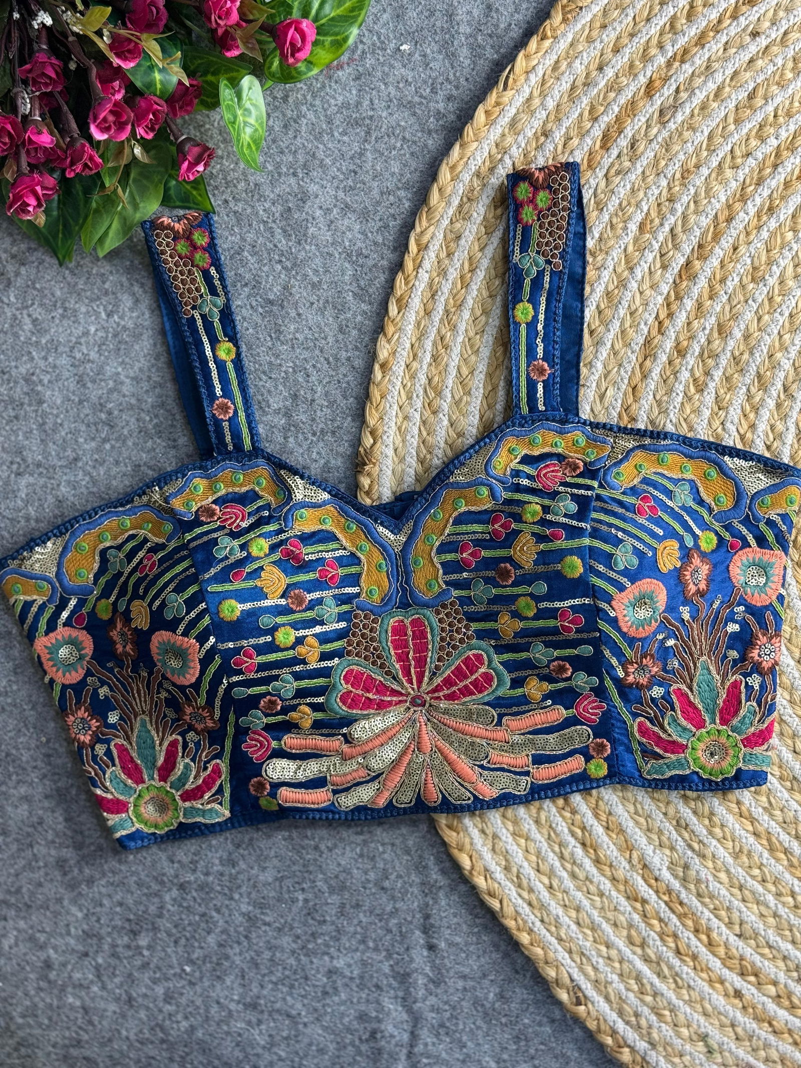 Celebrate this Navratri in style with our vibrant Gaji Silk designer blouse. Adorned with intricate multi embroidery work, it’s a perfect choice for garba nights and festive occasions. The soft cotton lining, perfect fit, and traditional charm make it a must-have partywear blouse for your ethnic wardrobe.