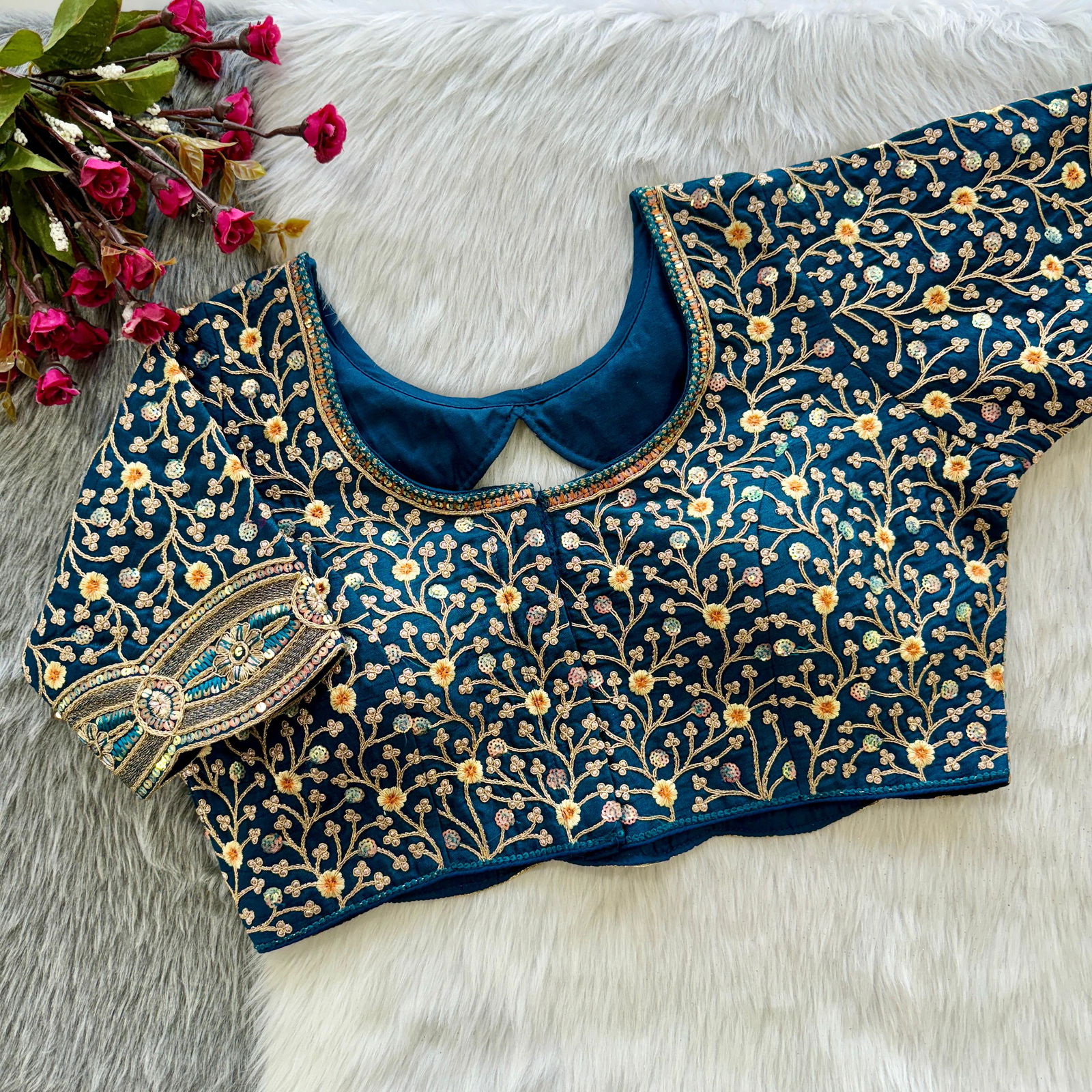 This bridal blouse is a perfect blend of tradition and style. Made from heavy soft TimoSilk fabric, it features rich codding embroidery, handwork, and sequence detailing. With heavy padding, front-open hooks, and elegant back cutwork design, it’s ideal for weddings. Available in size 40 and alterable up to 44.