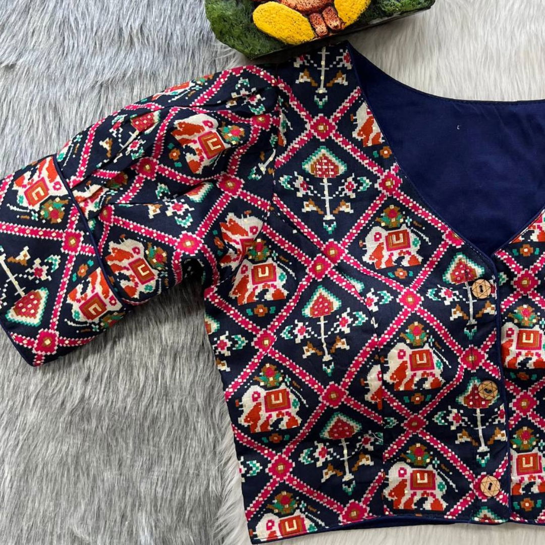 Introducing our exquisite "Patola Print Cotton Blouse" – a perfect blend of elegance and comfort. Crafted from pure cotton, this blouse showcases a stunning Patola print that adds a touch of sophistication to any ensemble. The Plus Size variant, with a ready alteration option up to 40 inches, ensures a flattering fit for all body types. The highlight of this blouse lies in its 10-inch puff sleeves, providing a chic and fashionable look. Ideal for parties, this blouse features a front-open style, beautifully stitched, and heavily padded for a graceful appearance. Elevate your style with this beautiful and versatile piece, perfect for any occasion.