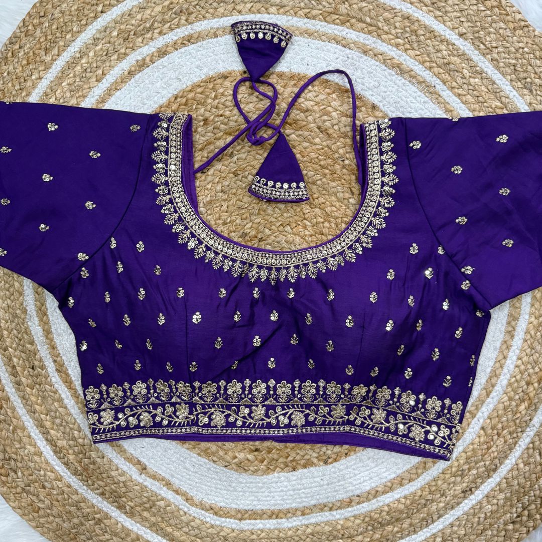 Shine effortlessly at weddings and special occasions with this exquisite bridal blouse. Made from heavy pure Roman silk, it features intricate embroidery and sequence work, 10-inch embroidered sleeves, heavy padding, and handmade hooks with charming latkans. Available in 10 stunning colors, this back-open style is ready at size 38 and alterable to 40 inches.