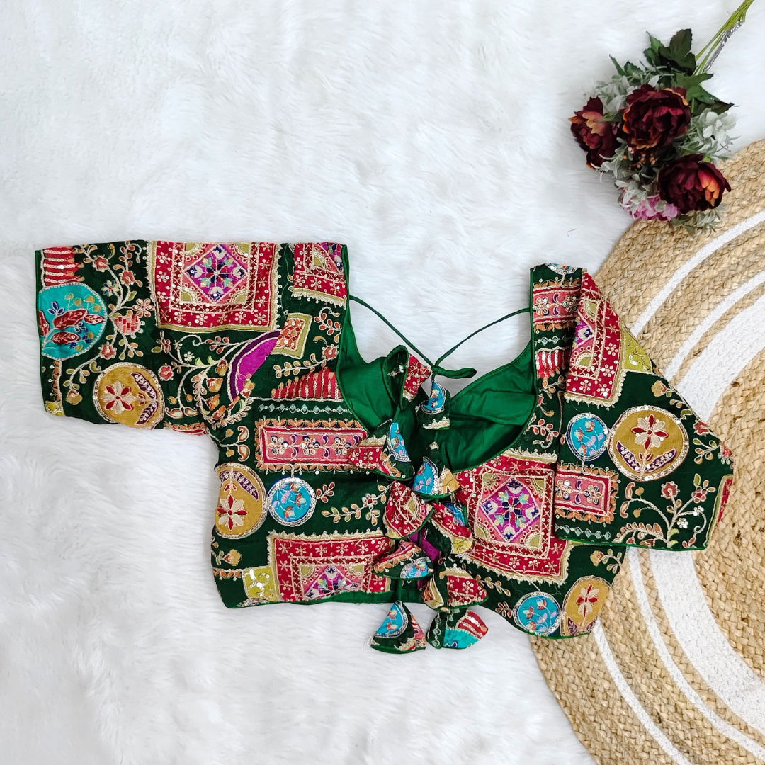 Elegant Chinon fabric blouse with digital print, perfect for Navratri. Lightweight, vibrant, and comfortable, ideal for festive celebrations. Stylish and unique for a standout look.