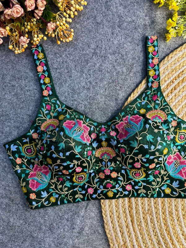This stunning blouse is crafted from premium Pure Gajji Silk and adorned with intricate embroidery and real handmade mirror work. Featuring a back open style with cotton lining and soft padding, it offers a comfortable yet festive fit. Sleeveless and stretchable up to size 42, it’s perfect for special occasions.