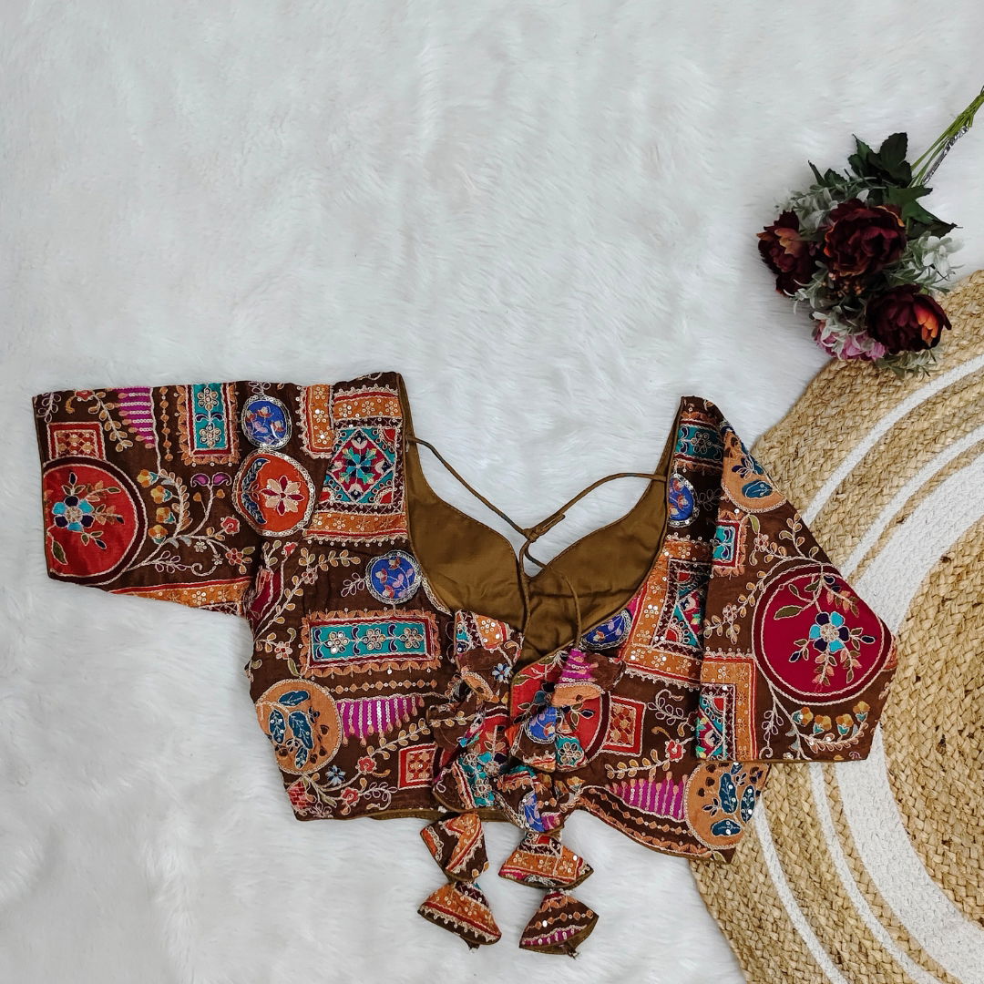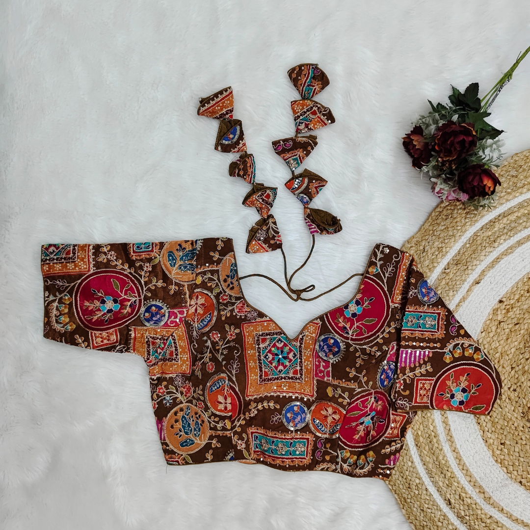 Elegant Chinon fabric blouse with digital print, perfect for Navratri. Lightweight, vibrant, and comfortable, ideal for festive celebrations. Stylish and unique for a standout look.