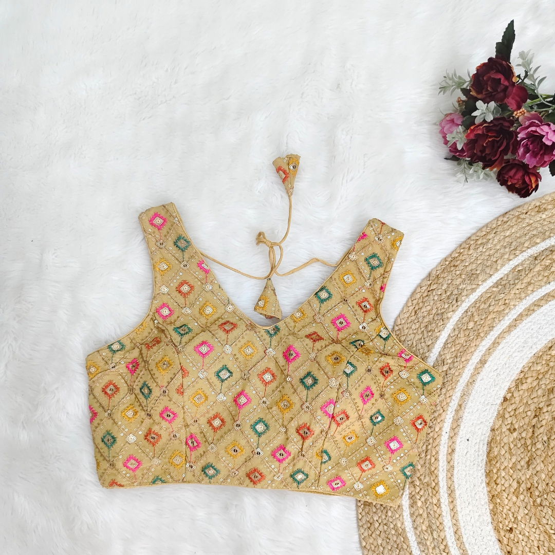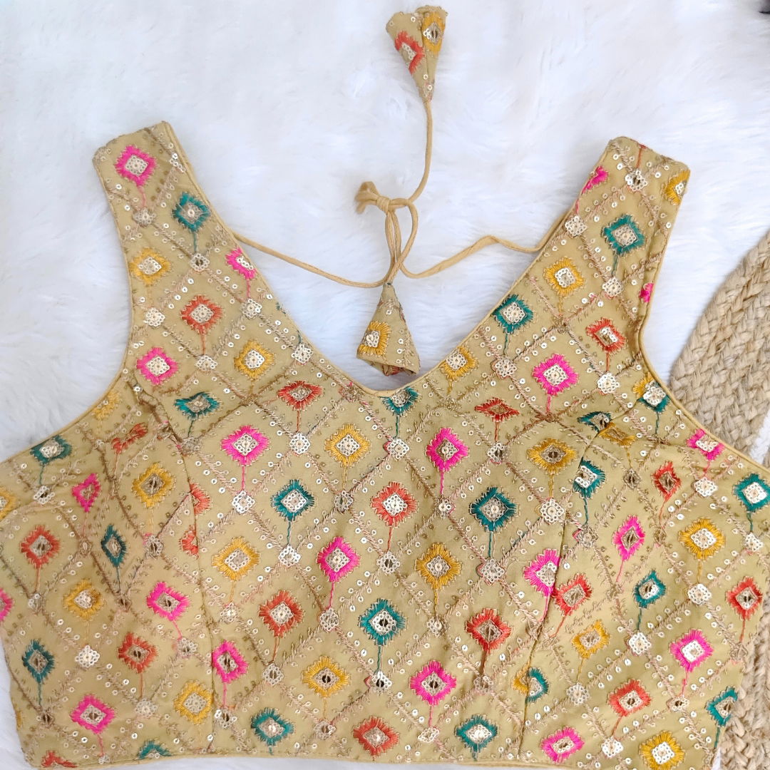 Georgette fabric blouse with multi-color embroidery, perfect for Navratri. Lightweight, vibrant, and stylish, ideal for festive celebrations. Enhance your look with this unique design.