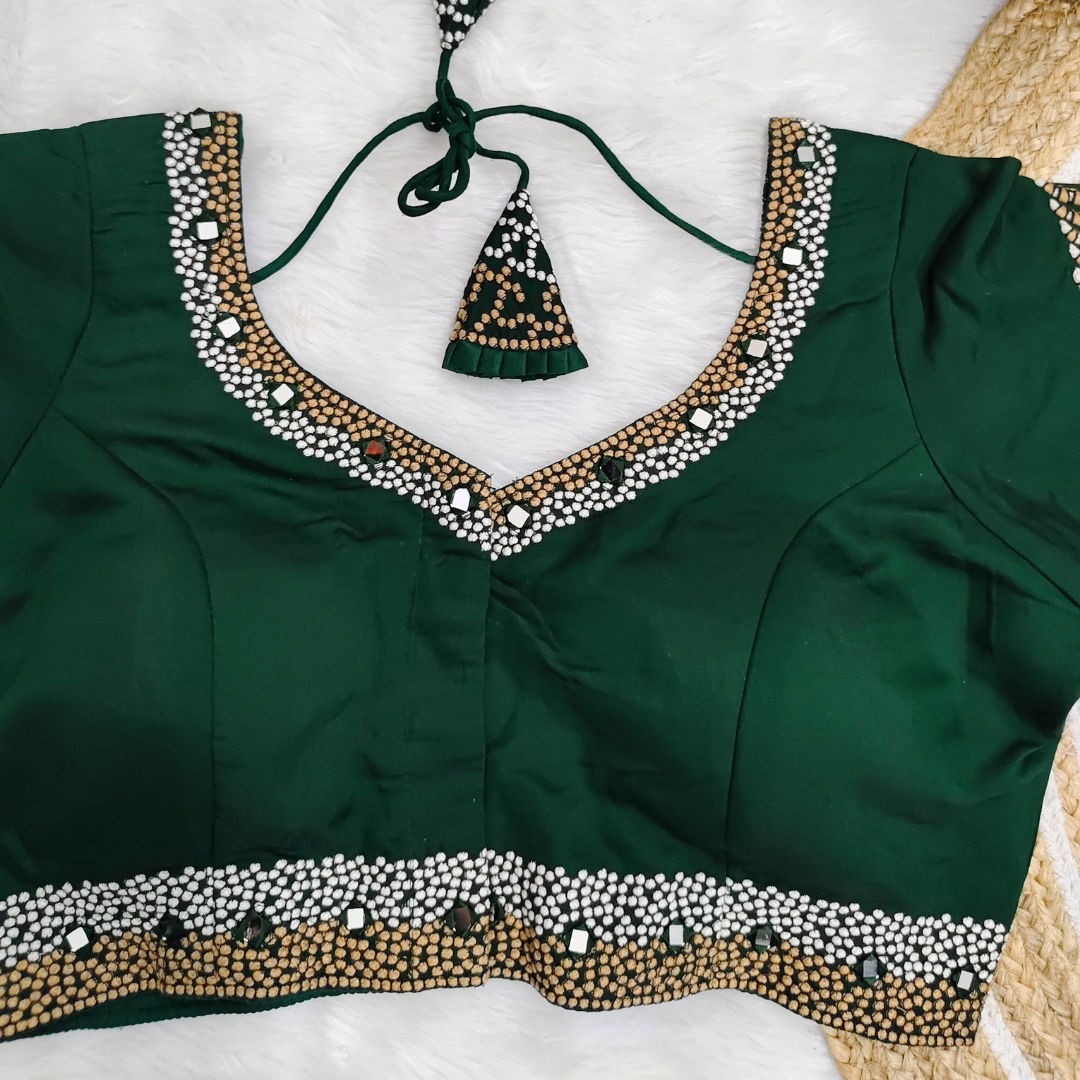 Pure Timo Silk handmade designer blouse with heavy thread embroidery and intricate handwork. Features real mirror embellishments. Elegant, unique, and perfect for special occasions.