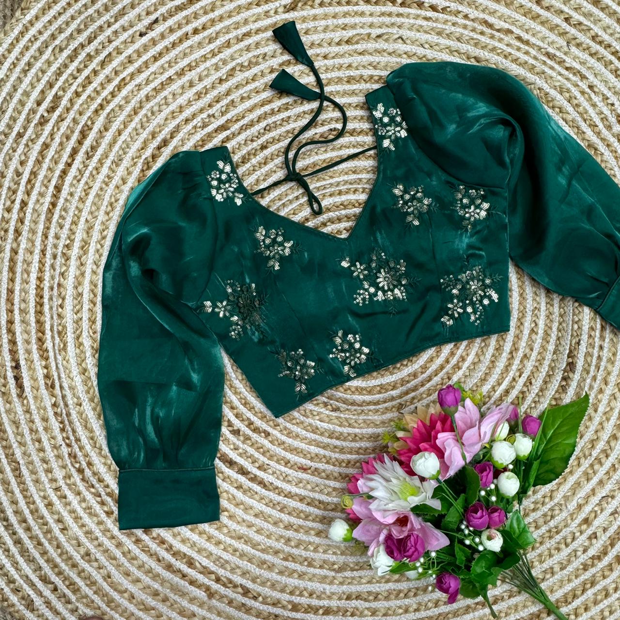 Fabric:-metalic jimmy choo Size:-38 upto 40 Pad: yes Sleeves:-17 inch + Height:15inch