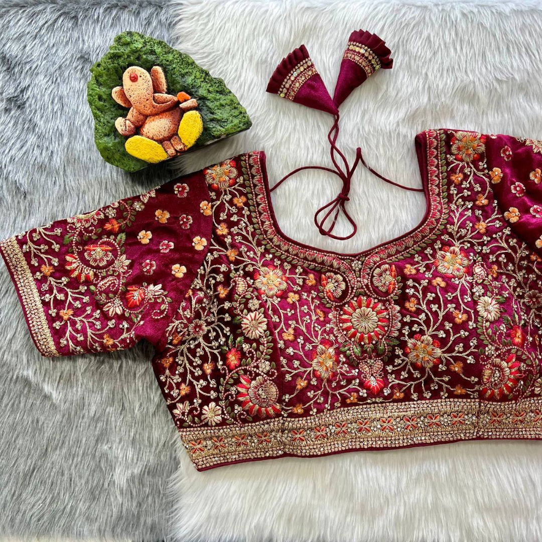 Made from luxurious heavy pure soft velvet with tricot fuising, the blouse ensures both comfort and opulence. Its versatile plus size, ready up to 42 inches, and 10-inch sleeves cater to diverse body types. The beautiful bridal design features heavy stitching, padded support, and handmade hooks, complemented by the allure of a back-open style.