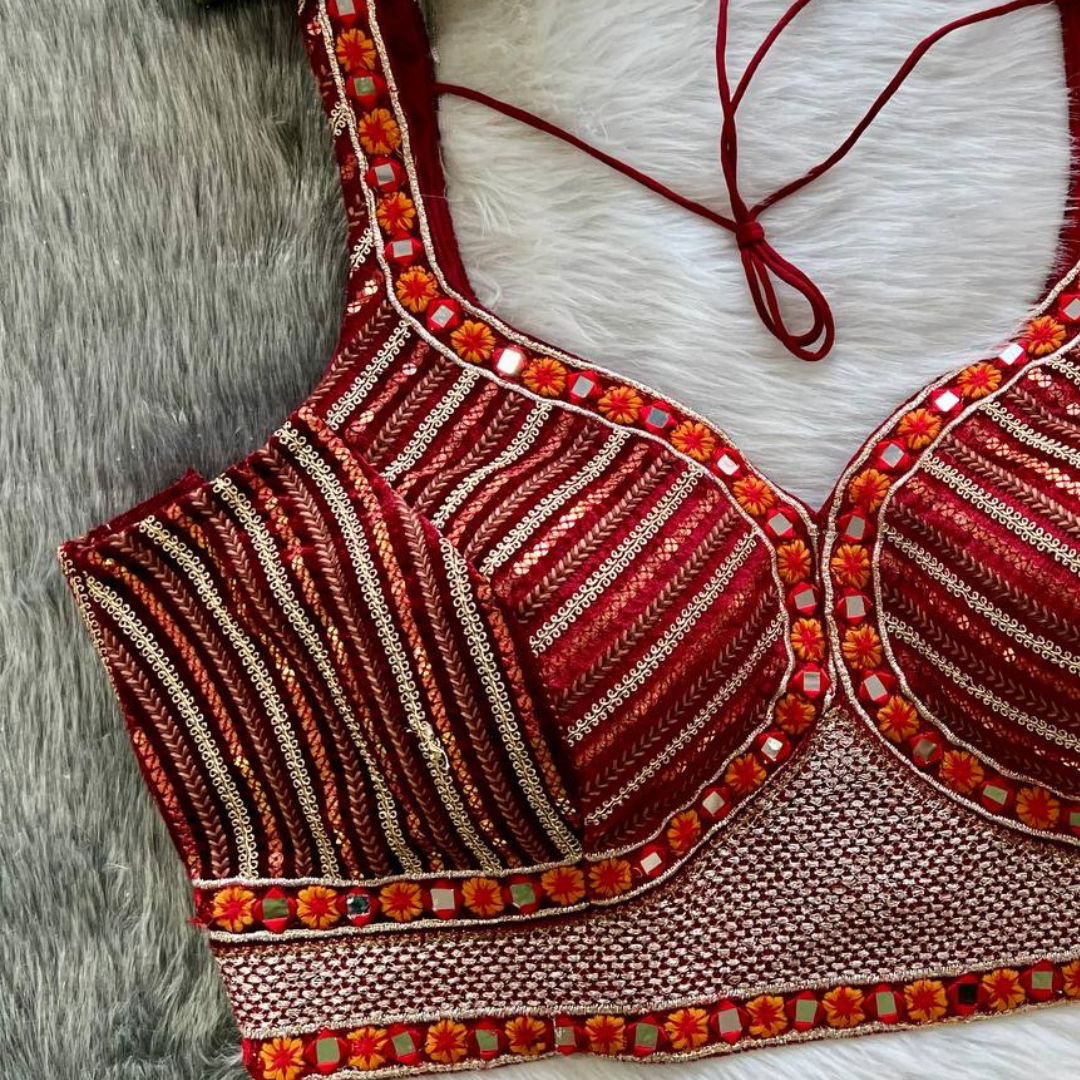 Introducing our exquisite "Heavy Velvet Work Bridal Blouse" - a perfect blend of elegance and opulence for your special day. Crafted with precision, the blouse features intricate heavy embroidery and mirror handwork on sumptuous pure soft velvet, fused with Tricot for added luxury. The Plus Size variant is ready to be altered up to 42 inches, ensuring a perfect fit. The 10-inch sleeves, adorned with beautiful handmade hooks and latkans, add a touch of sophistication. The back-open style enhances the allure of this bridal masterpiece. Elevate your wedding ensemble with this stunning blend of craftsmanship and style, making your special day truly unforgettable.
