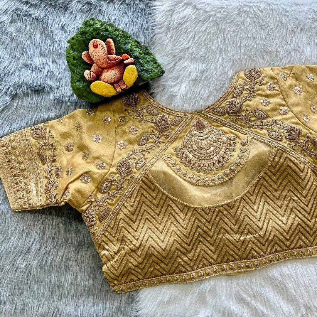 Introducing our exquisite "Heavy Wedding Blouse" crafted for the discerning bride seeking timeless elegance. This opulent blouse features intricate GOLD Jari with Rainbow 4 Sequence Heavy Embroidery Work, creating a dazzling masterpiece. The luxurious fabric, Heavy TIMO Silk, ensures a regal feel. Available in Plus Size 40” (alterable up to 42 inches), this blouse boasts a Beautiful Gold Work bridal design, meticulously stitched with Heavy Padded Handmade Hooks and adorned with Beautiful Latkans. The Front open Style adds a touch of modern sophistication. Elevate your bridal ensemble with this statement piece, a perfect blend of tradition and contemporary style.