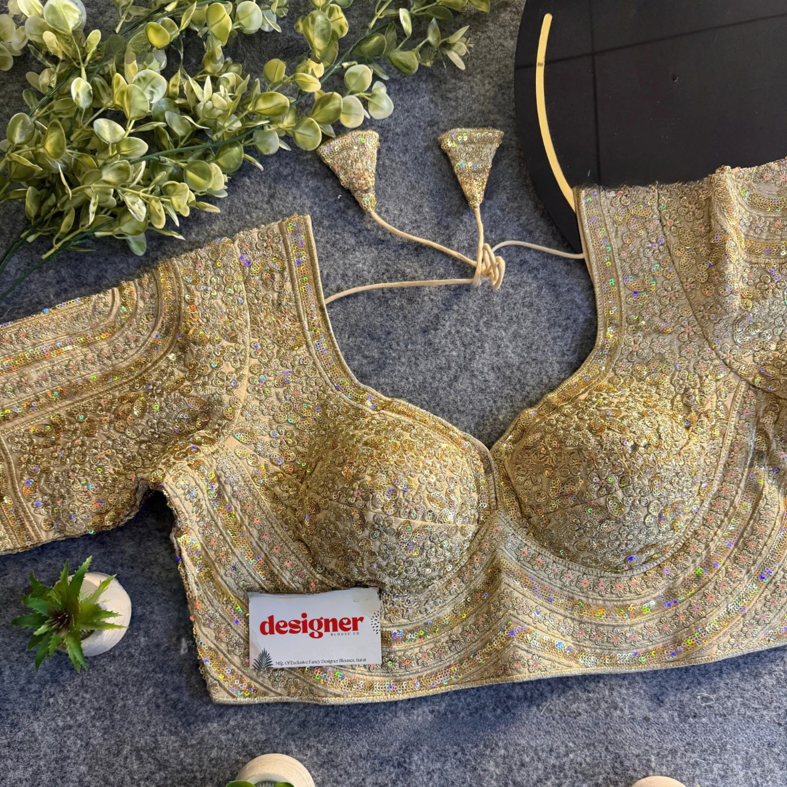 This Italian Silk Sabyasachi neck designer blouse features exquisite heavy coding and shimmering sequin handwork for a true luxury look. With pure cotton lining, built-in pads, full sleeves and back-open hooks, this blouse is perfect for grand wedding, party and festive saree or lehenga styling.