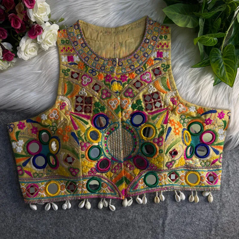 Celebrate this Navratri with elegance in our heavy Italian silk blouse, adorned with intricate embroidery, hand mirror work, and sequence detailing. The sleeveless, front-open design with soft padding adds both comfort and festive glam. Perfect for Garba nights and dandiya celebrations, this designer blouse brings out your radiant traditional style.
