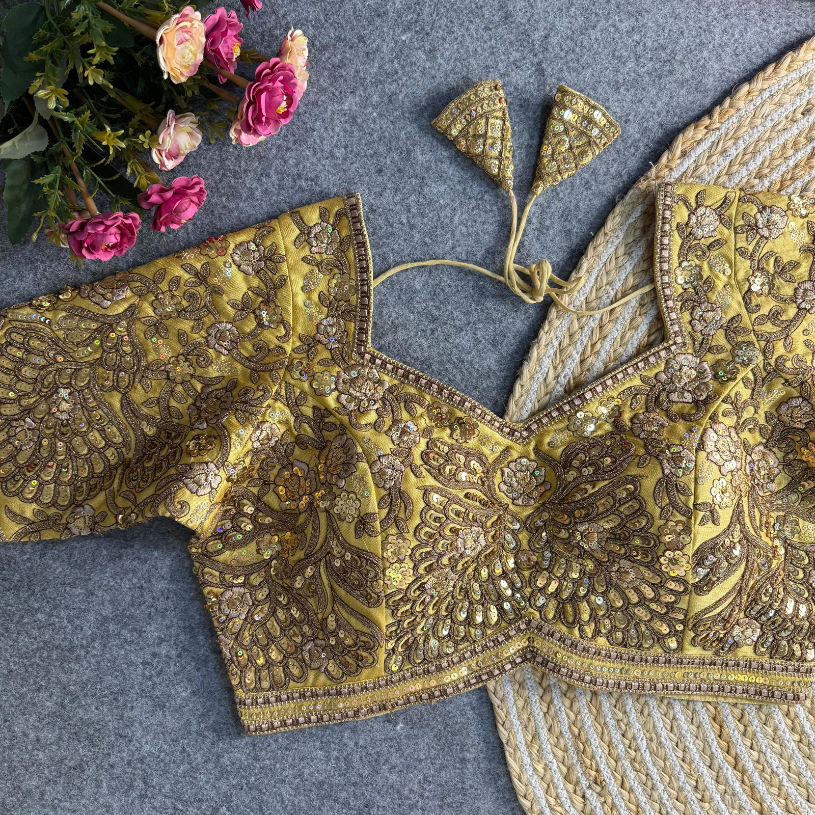 Grace your bridal look with this designer blouse crafted from heavy pure soft Italian silk. Featuring elegant codding embroidery and sequin work, it’s heavily padded with fine stitching. The back-open style with handmade hooks and latkans adds charm, making it perfect for weddings and grand celebrations.