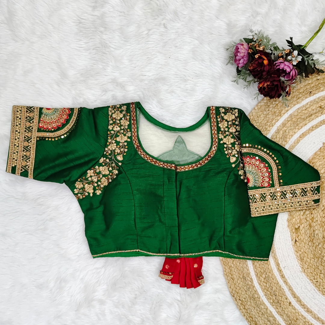This fancy bridal blouse features heavy embroidery and stunning 3D Barbie work. Designed for partywear, it has heavy stitching, padded support, and a beautiful front-open style