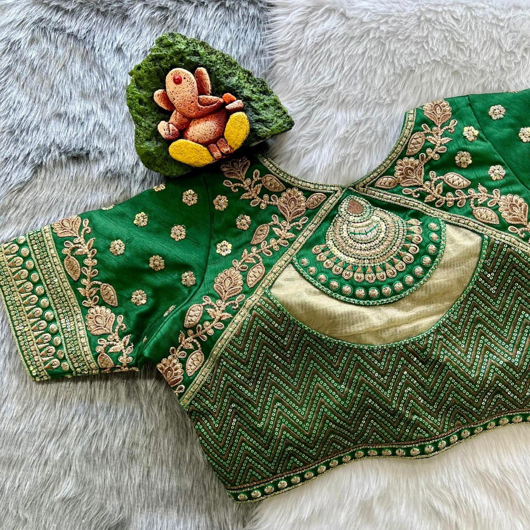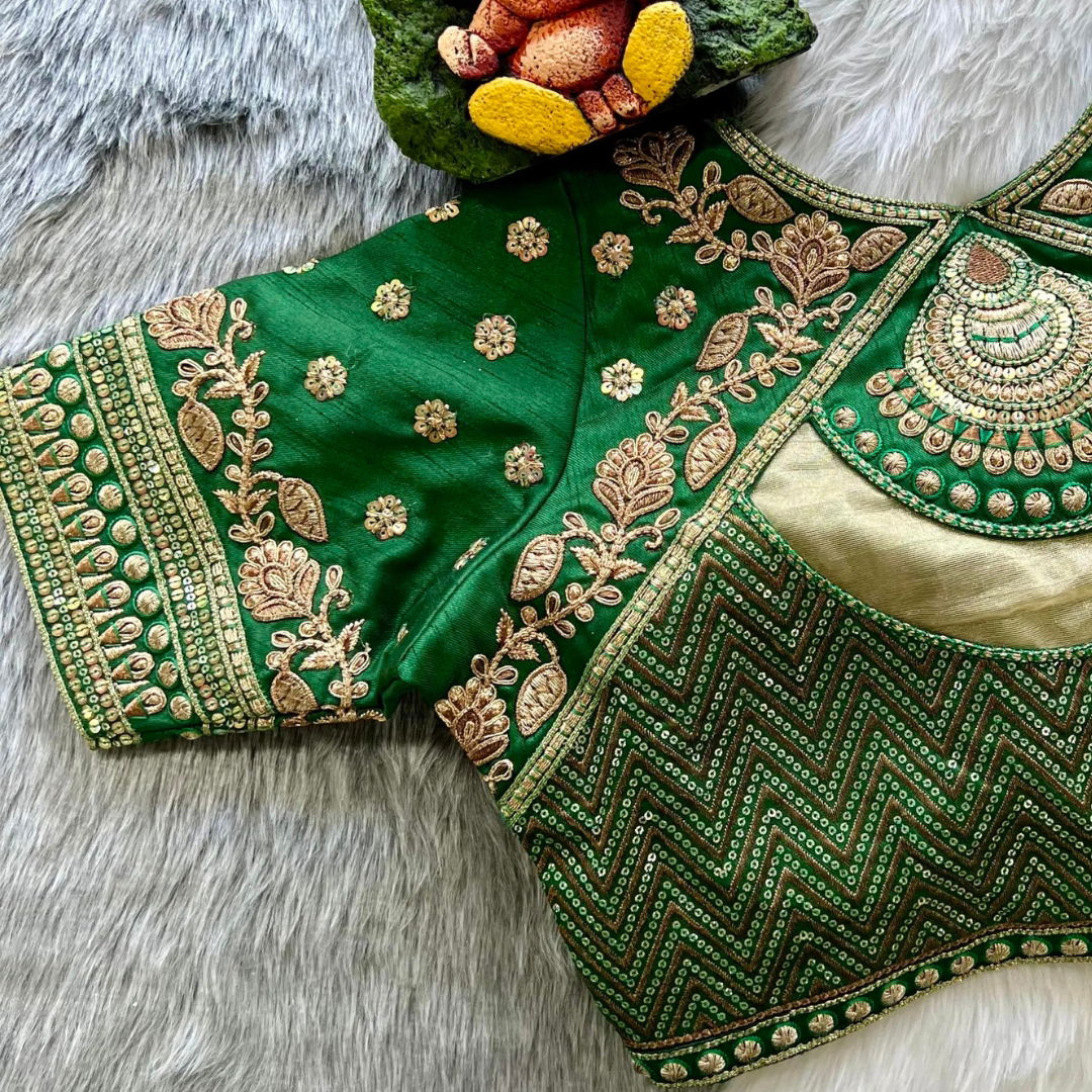 Introducing our exquisite "Heavy Wedding Blouse" crafted for the discerning bride seeking timeless elegance. This opulent blouse features intricate GOLD Jari with Rainbow 4 Sequence Heavy Embroidery Work, creating a dazzling masterpiece. The luxurious fabric, Heavy TIMO Silk, ensures a regal feel. Available in Plus Size 40” (alterable up to 42 inches), this blouse boasts a Beautiful Gold Work bridal design, meticulously stitched with Heavy Padded Handmade Hooks and adorned with Beautiful Latkans. The Front open Style adds a touch of modern sophistication. Elevate your bridal ensemble with this statement piece, a perfect blend of tradition and contemporary style.