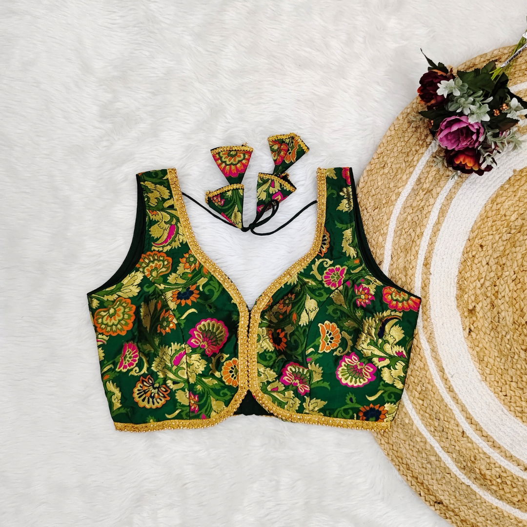 Elevate your Navratri style with our stunning Jacquard Fabric Blouse. Intricately crafted with heavy stitching and padding, featuring a beautiful apple cut design and back hooks open style, perfect for the festive Garba celebrations.