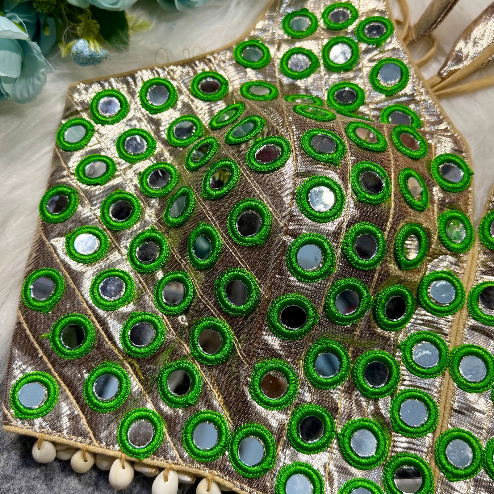 Shine bright in this Navratri readymade blouse, featuring vibrant multi-color circular mirror work and a classic dori-tie back. Crafted for festive flair, it’s adorned with shell lace for that authentic dandiya vibe. Perfect for Garba nights, this blouse pairs beautifully with lehengas, skirts, or sarees for an eye-catching traditional look.