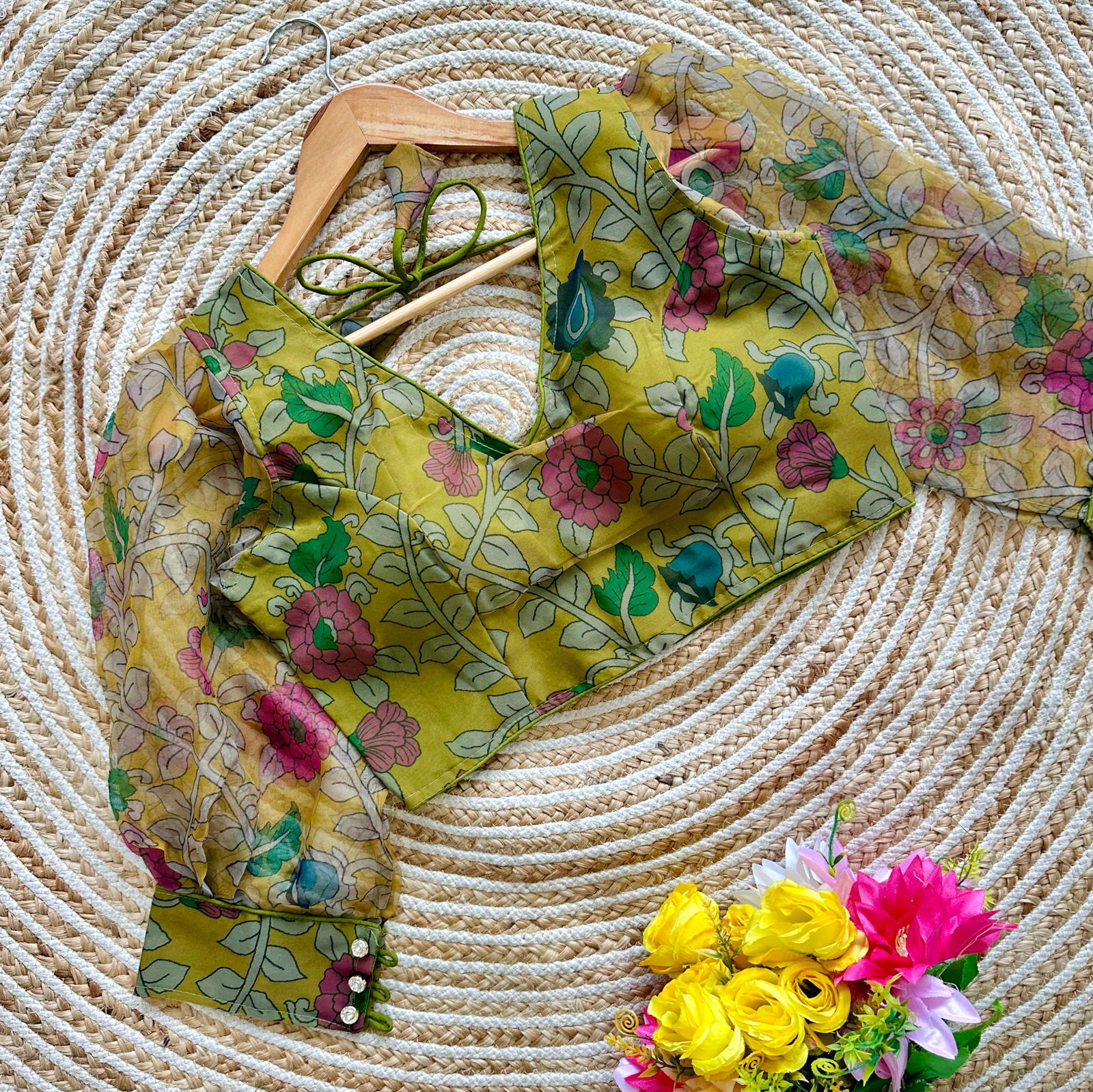 Elevate your wardrobe with this beautiful Organza blouse, boasting a stunning print and designer look. Perfect for staying on-trend, this stylish and versatile piece adds flair to your collection