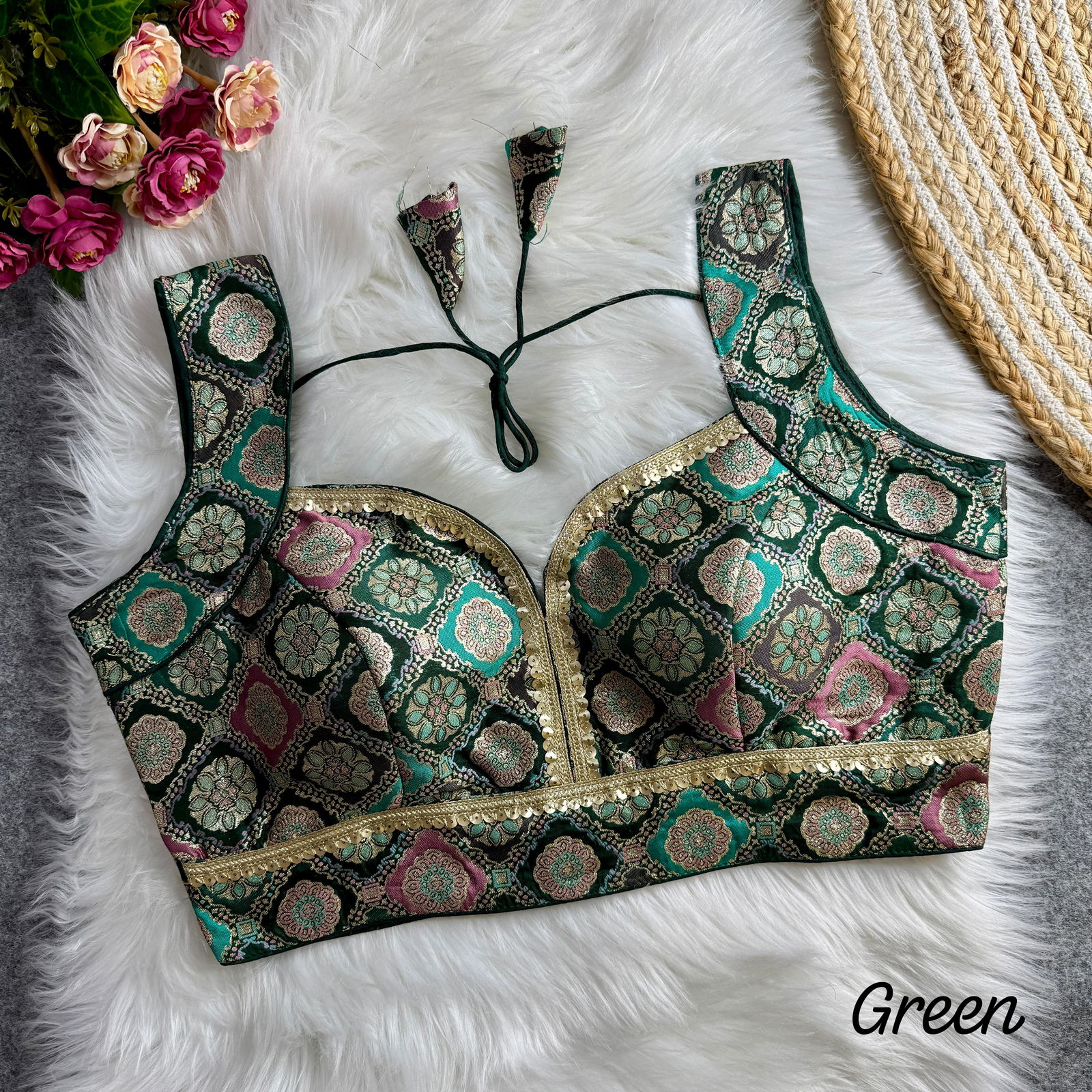 Add a touch of elegance to your ethnic wardrobe with this Amrita Silk Rapier Jacquard blouse. Crafted with pure Indo cotton lining for comfort, it features heavy padding, intricate stitching, and a back-open style. With 5-inch inner sleeves and available in 10 stunning colors, it's alterable from 38 to 40 inches.