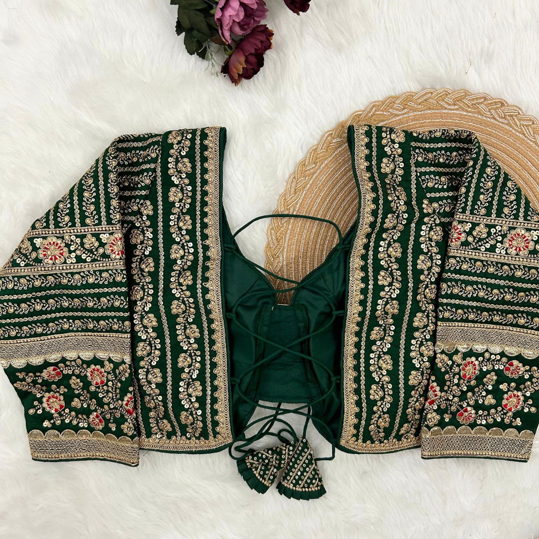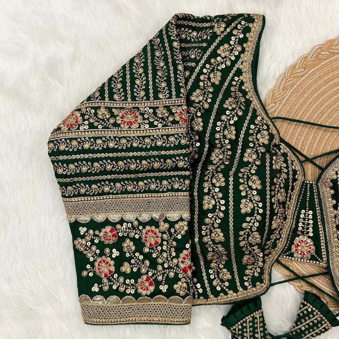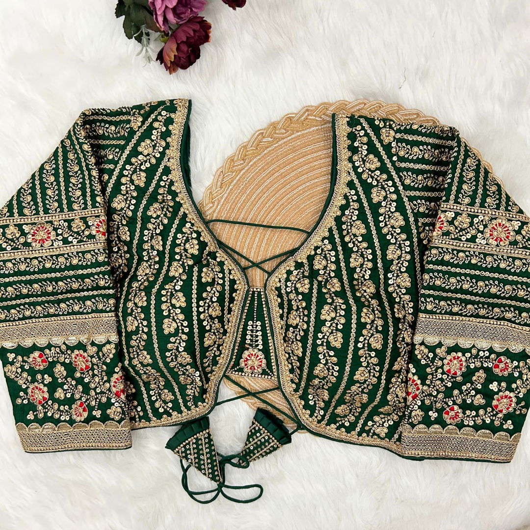 Make a statement in this beautiful bridal look blouse featuring a backless design with stylish dori. Crafted from rich Timo Silk, it comes with extra-long18-inch sleeves and soft padding for comfort. Perfect for weddings or special occasions, this designer blouse is ready in size 40 and alterable up to 44.