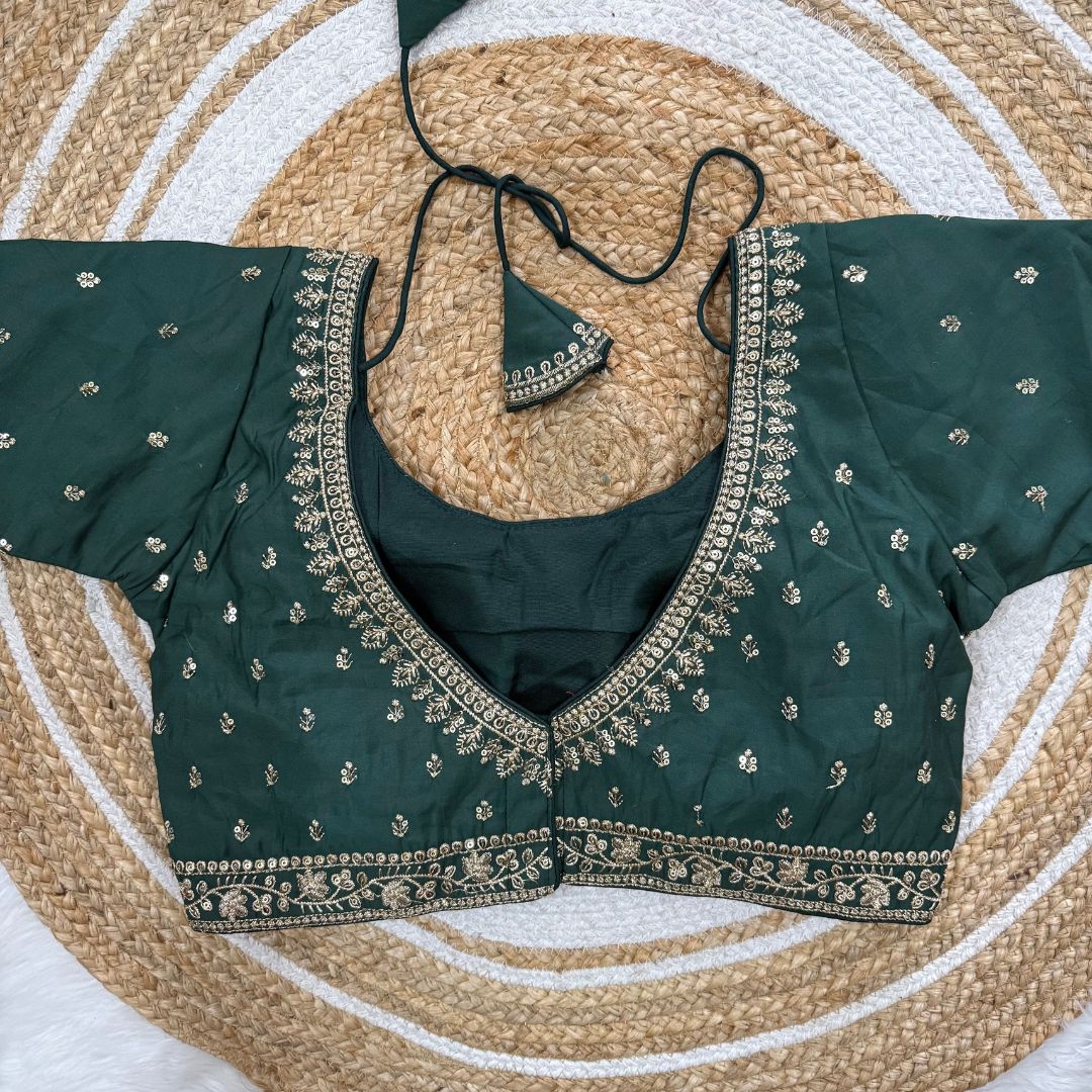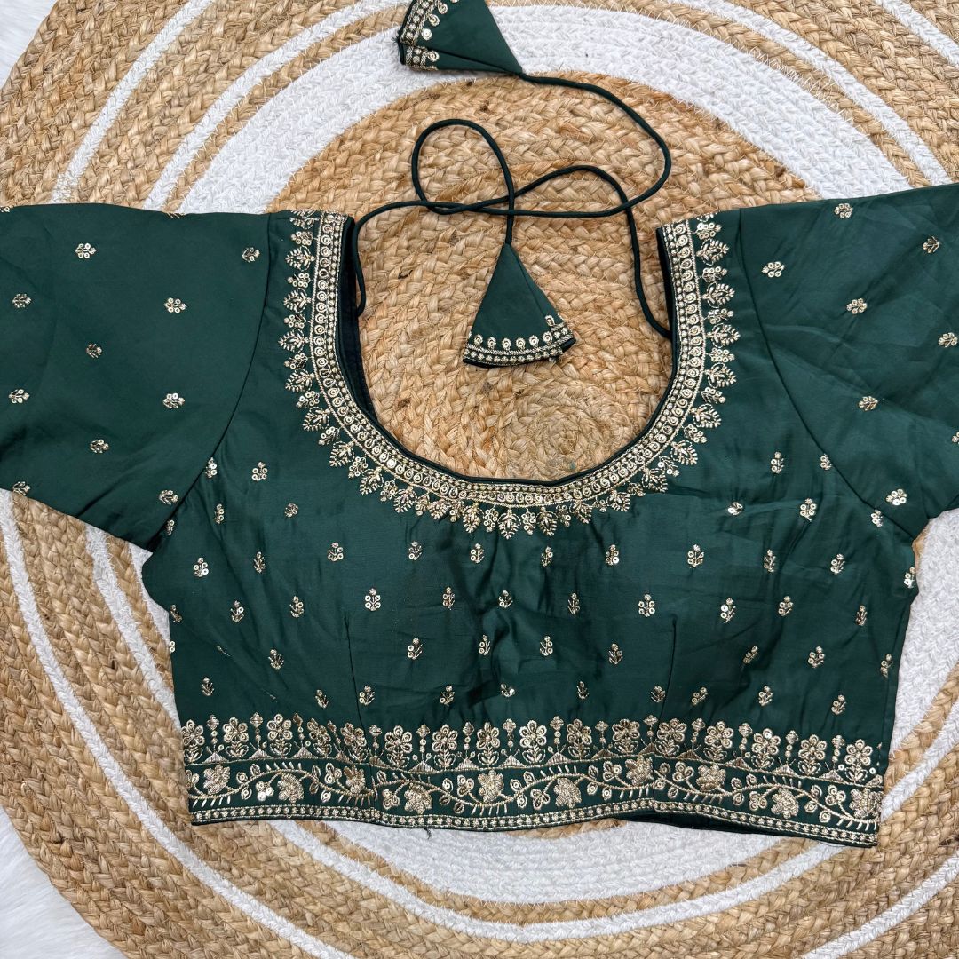 Shine effortlessly at weddings and special occasions with this exquisite bridal blouse. Made from heavy pure Roman silk, it features intricate embroidery and sequence work, 10-inch embroidered sleeves, heavy padding, and handmade hooks with charming latkans. Available in 10 stunning colors, this back-open style is ready at size 38 and alterable to 40 inches.