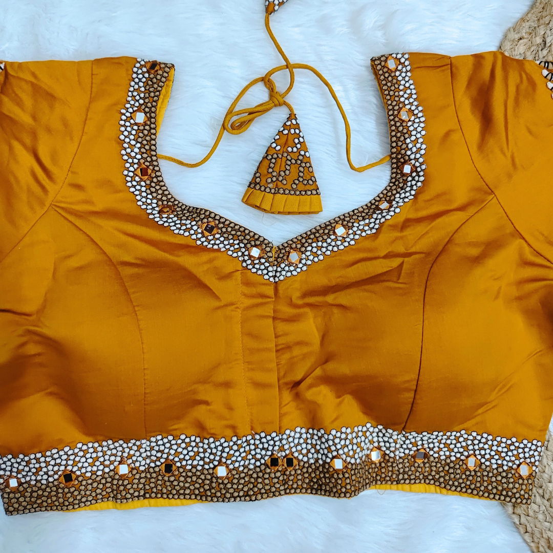 Pure Timo Silk handmade designer blouse with heavy thread embroidery and intricate handwork. Features real mirror embellishments. Elegant, unique, and perfect for special occasions.