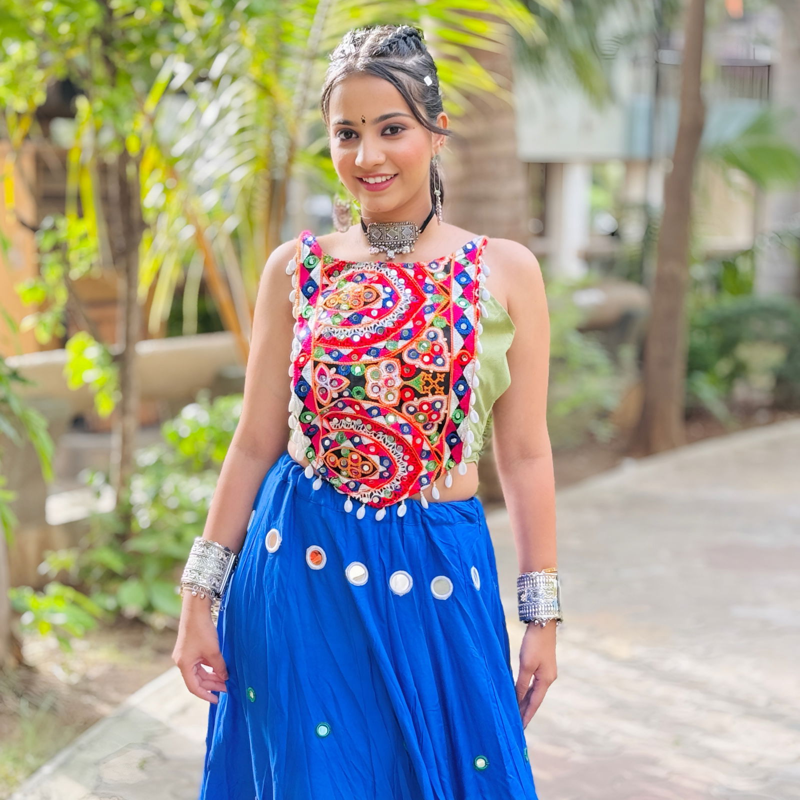 Make a bold statement with our Heavy Blue Mirror Work Chaniya with Green Choli. Featuring intricate mirror work and vibrant color contrast, this readymade set is perfect for Navratri and festive events. Designed for comfort and elegance, this outfit ensures you stand out with its unique design and flawless craftsmanship.