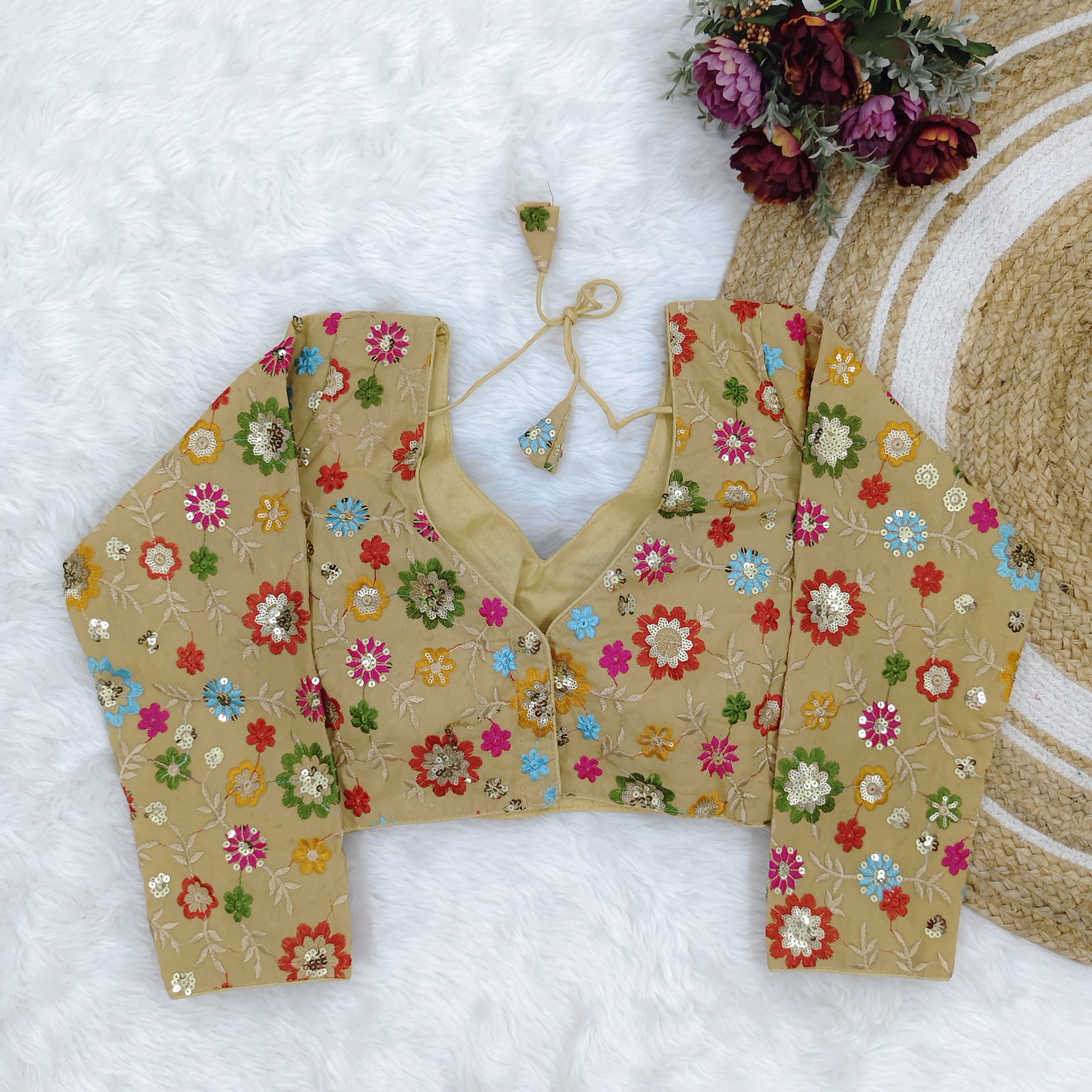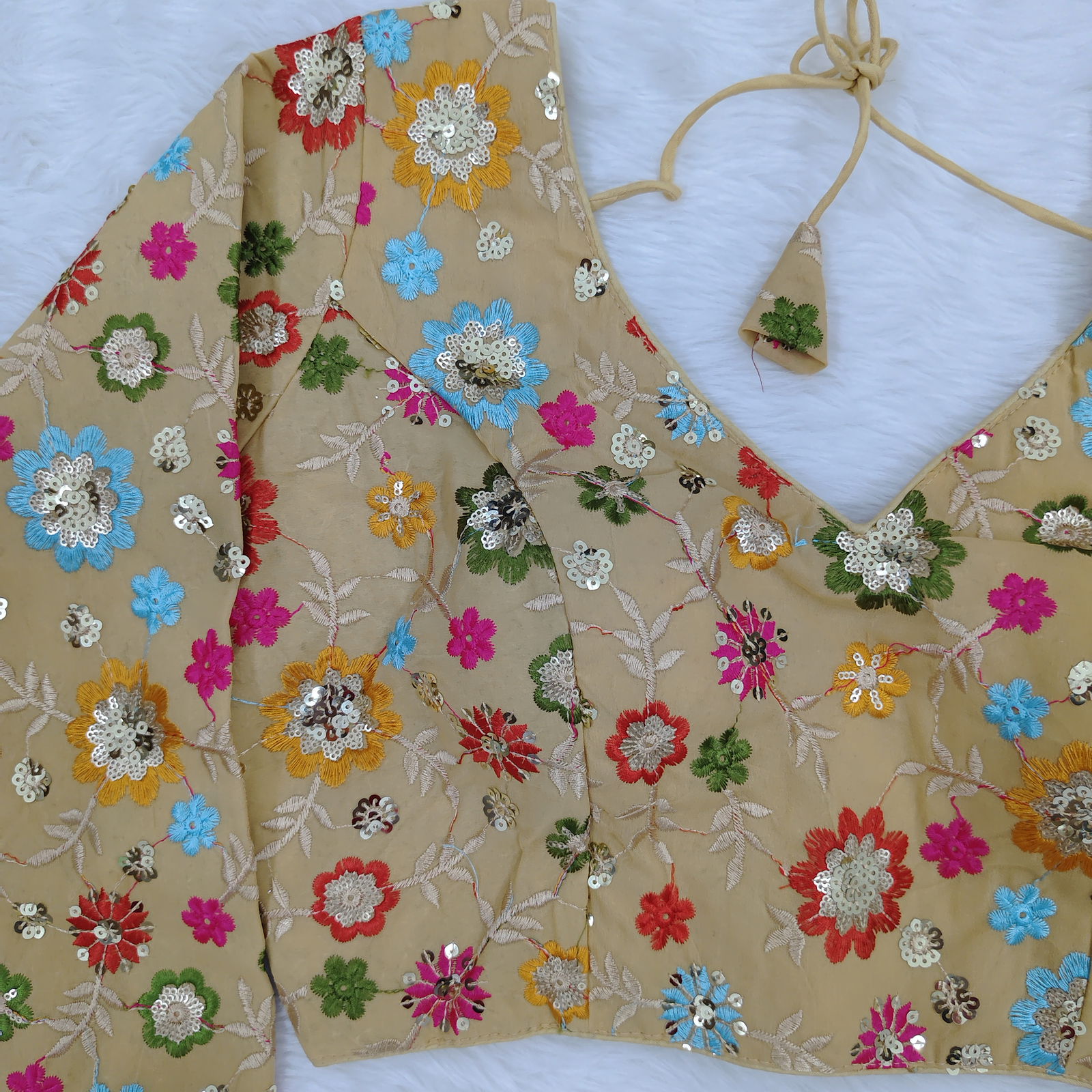 Stunning fox georgette blouse with intricate sequence work, featuring a stylish open-back design